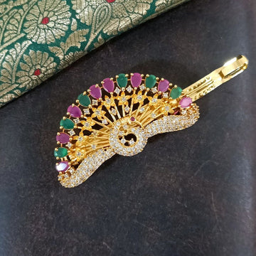 SKU : HR0014 This designer hair clip, the Gold Finish AD Crystal Ruby Emerald Dancing...