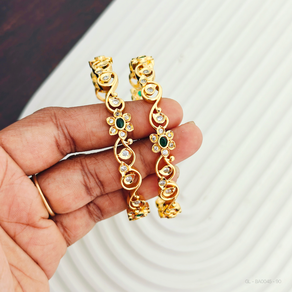 - 2 Pc set AD Stone Trending floral line Bangle Set is designed with a gold finish and a center stone in green. It comes as a set of 2 pieces for a complete and stylish look.