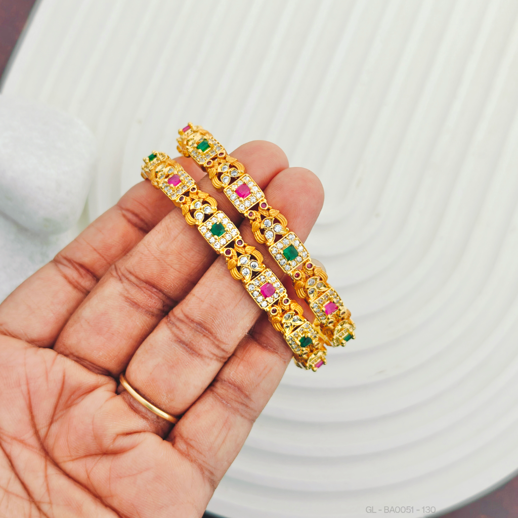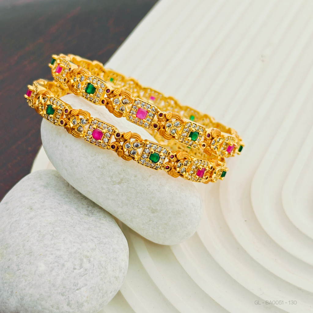 - This product, the 2 Pc Set Traditional Kemp Stone Bangle set features a striking gold finish paired with a beautiful combination of pink and green stones. This bangle set is the perfect blend of tradition and modernity.