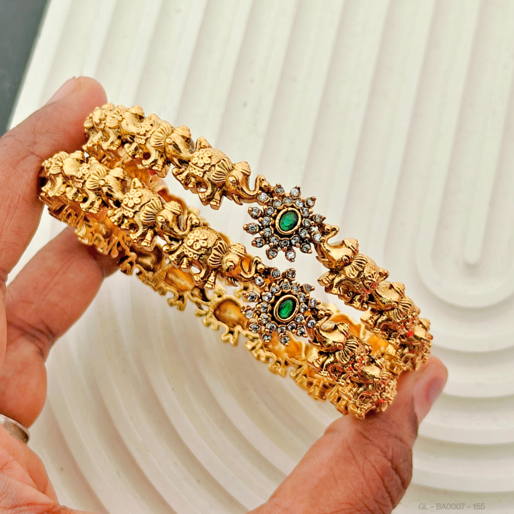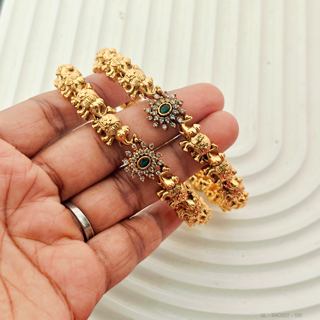 - This 2-piece set of golden Bangles features a stunning gold finish and CZ stones, along with a beautiful floral and elephant design.