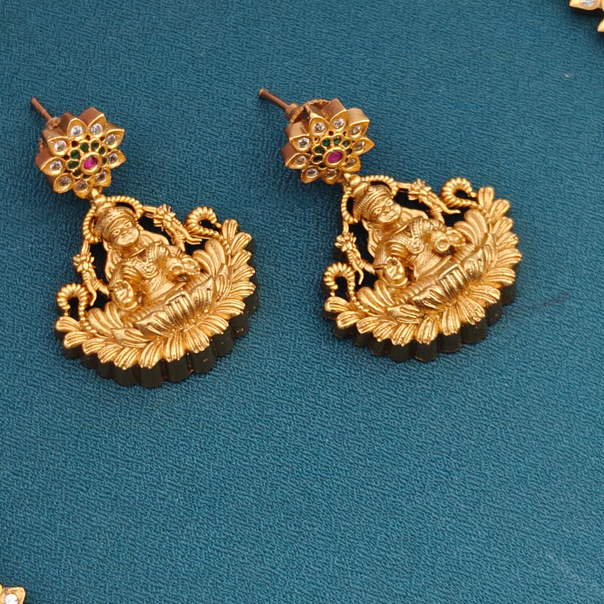 A professionally crafted masterpiece, the 3 layer Lakshmi Coin Temple Haaram features a gold finish with a coin sequence design. Adorned with a double-sided Lakshmi pendant and matching Lakshmi earrings, this haram showcases exquisite craftsmanship and sacred symbolism