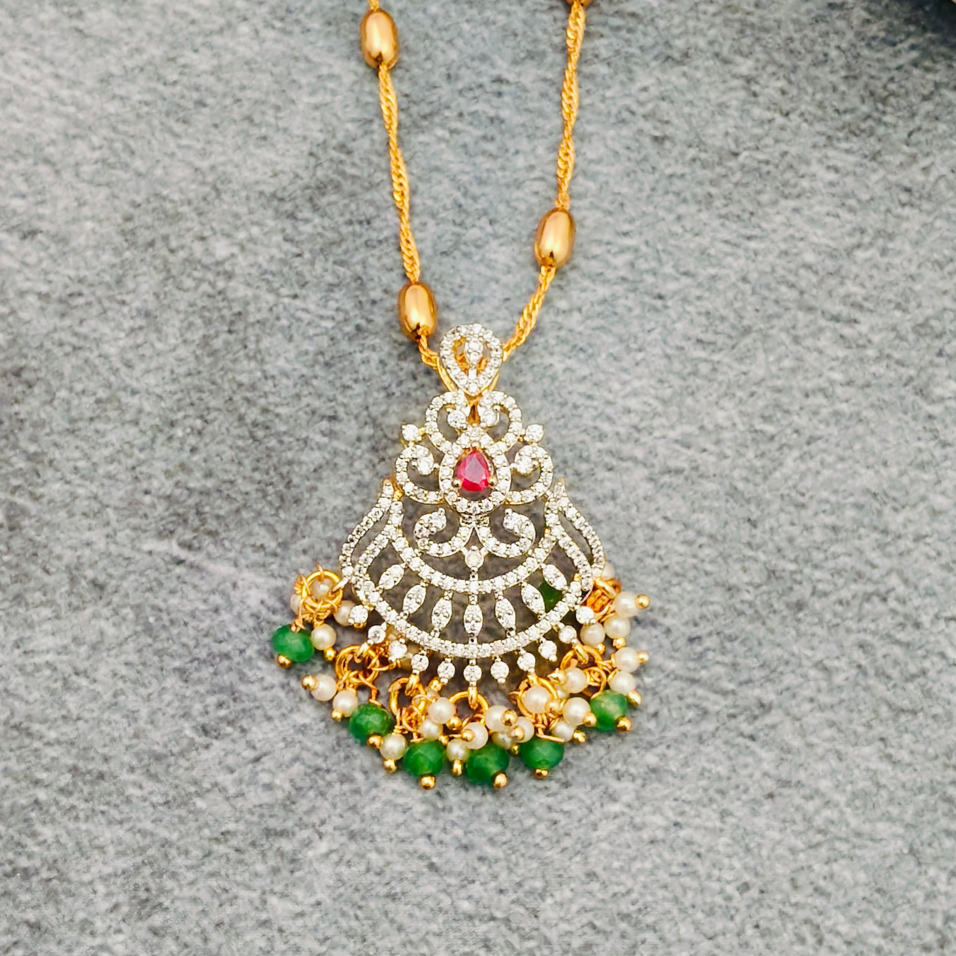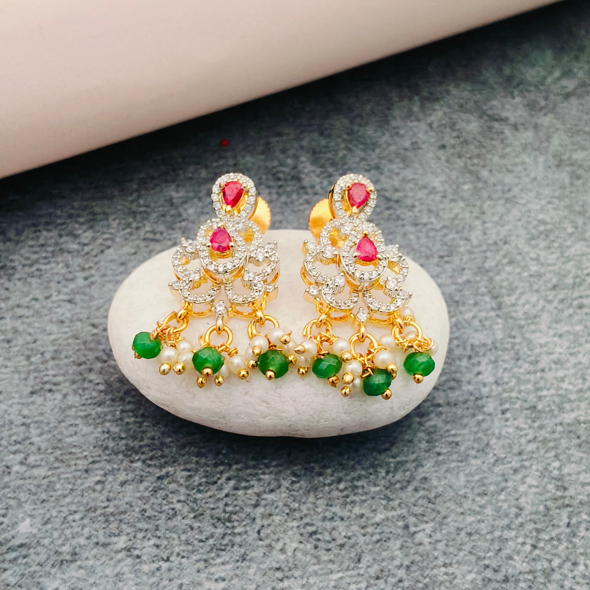This set features an elegant white stones with light gold finish with a striking Purple centered stone, accompanied by matching earrings.