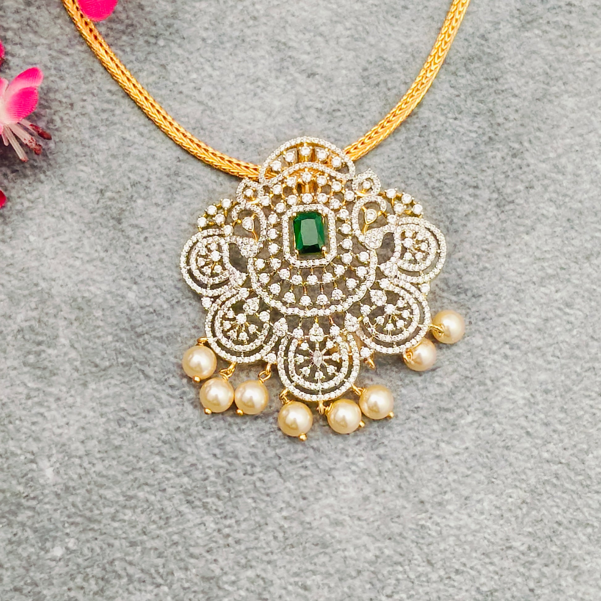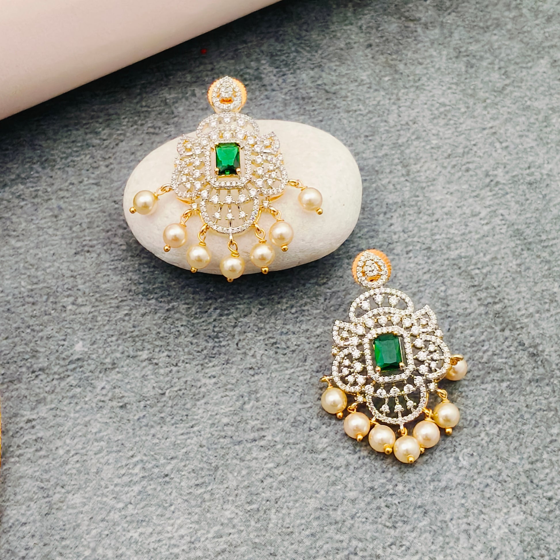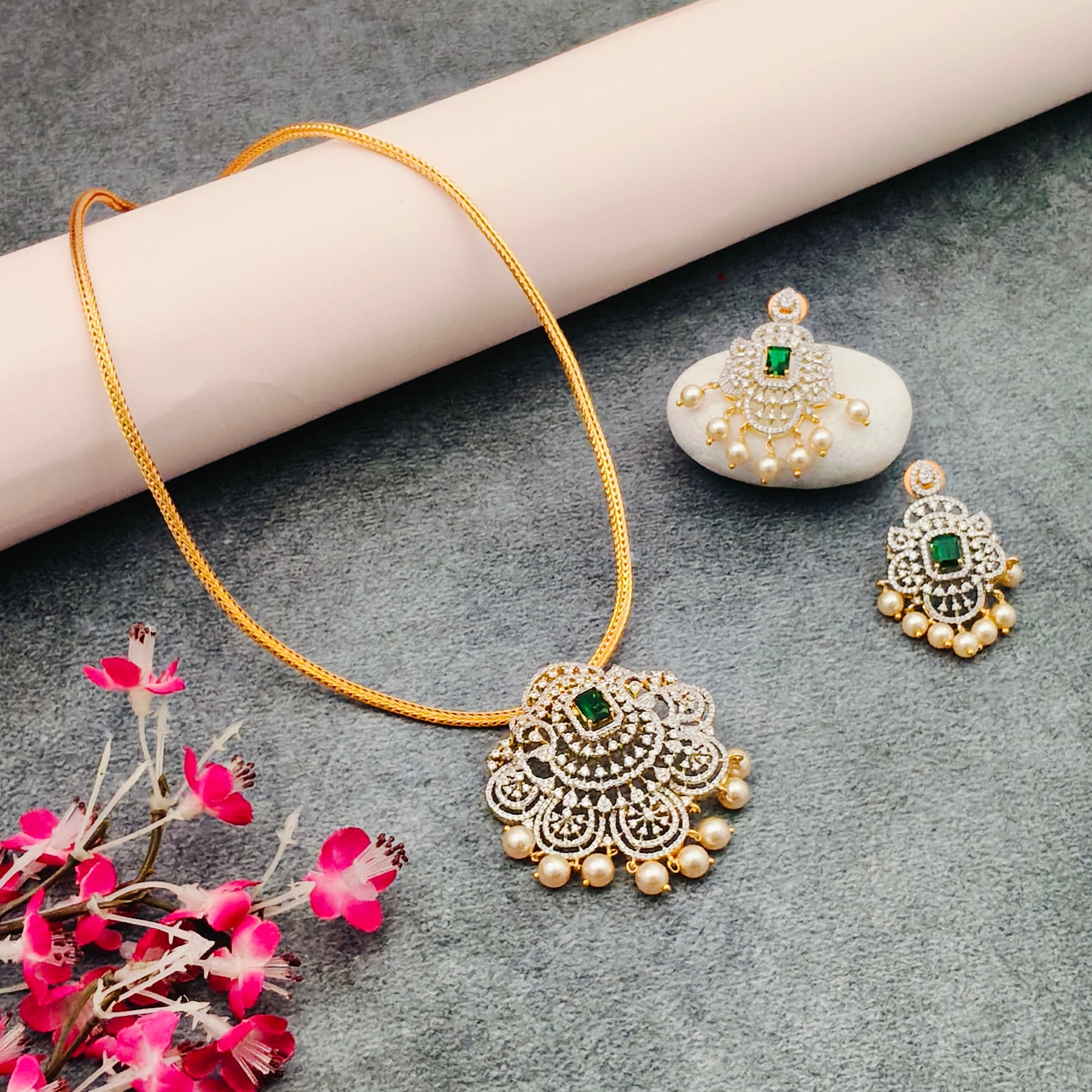 This set features an elegant white stones with light gold finish with a striking Purple centered stone, accompanied by matching earrings.