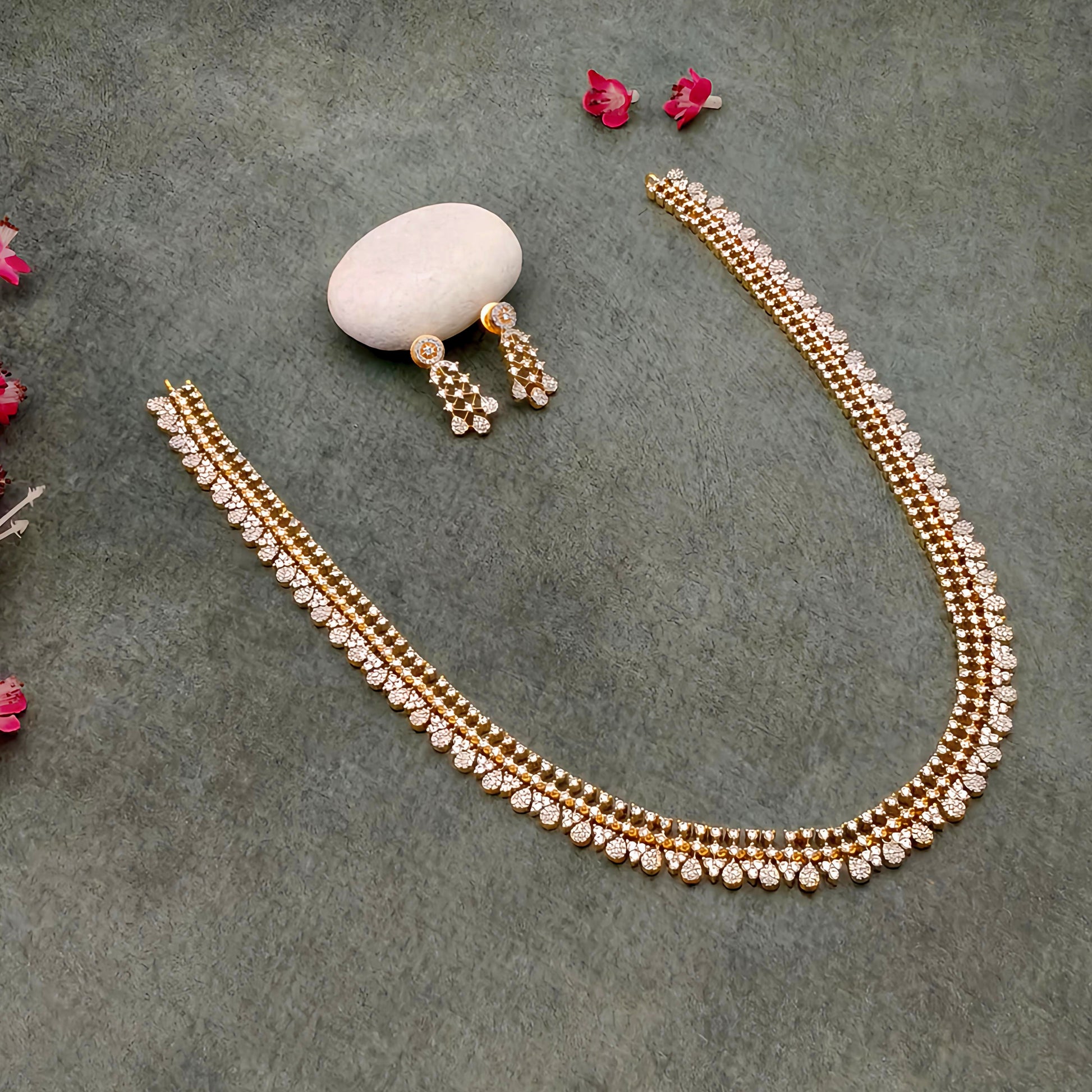 - This necklace set features floral pattern necklace in AD white stone that is lightweight and minimal.