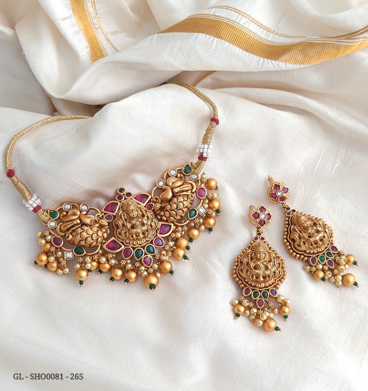 - Gold finish Temple Jadau Kundan Highneck - Choker with a beautiful golden pearl embellishment and featuring a traditional design with Lakshmi peacock and green and red stones.
