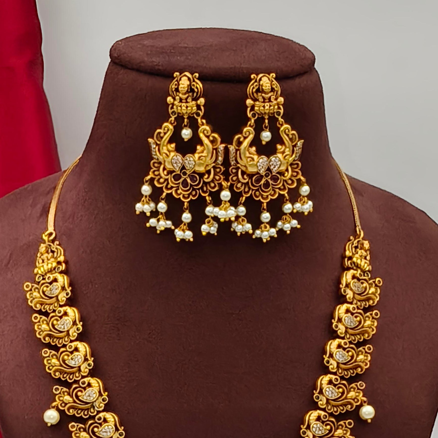 Expertly crafted with a premium gold finish, this long necklace set features a traditional Lakshmi design adorned with ruby red, pink, and green stones. Complete with matching earrings featuring elegant Pearl drops, this exquisite set is a must-have for any jewelry collection..