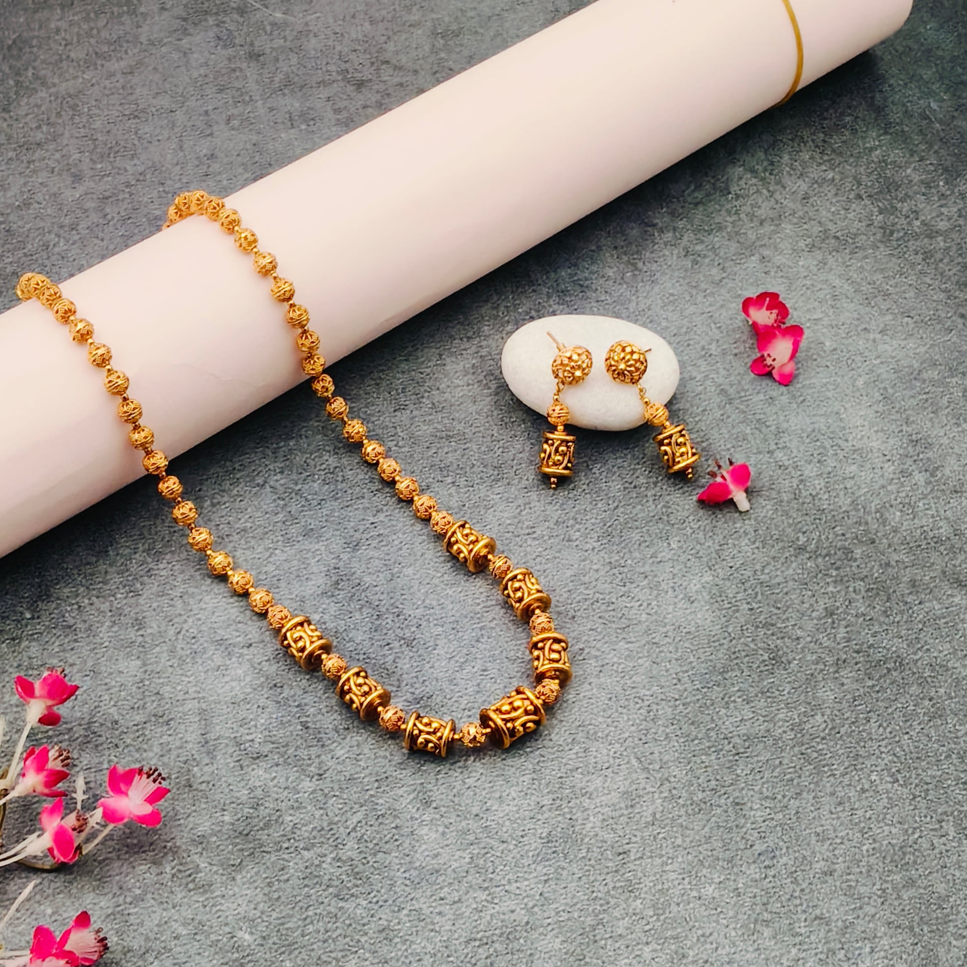Enhance your collection with the elegant antique Golden Beaded Mala Set, complete with matching earrings.
