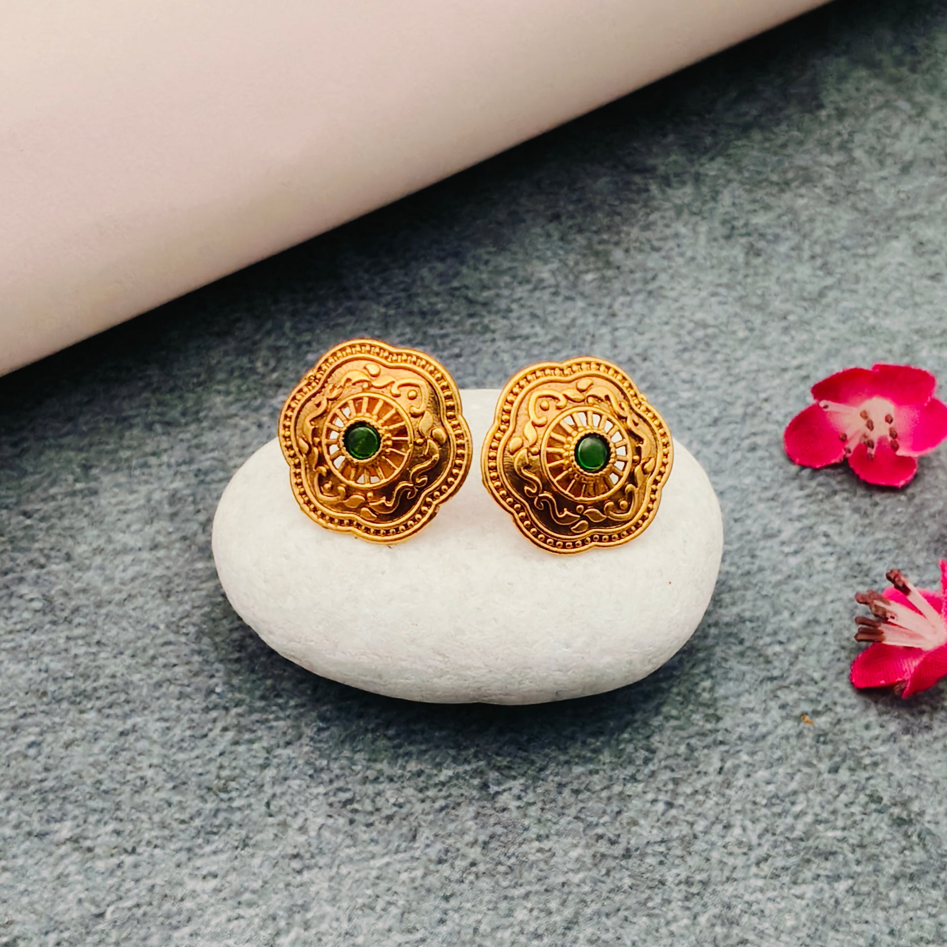 This set features an antiqued golden locket with a striking green center stone, accompanied by matching earrings.