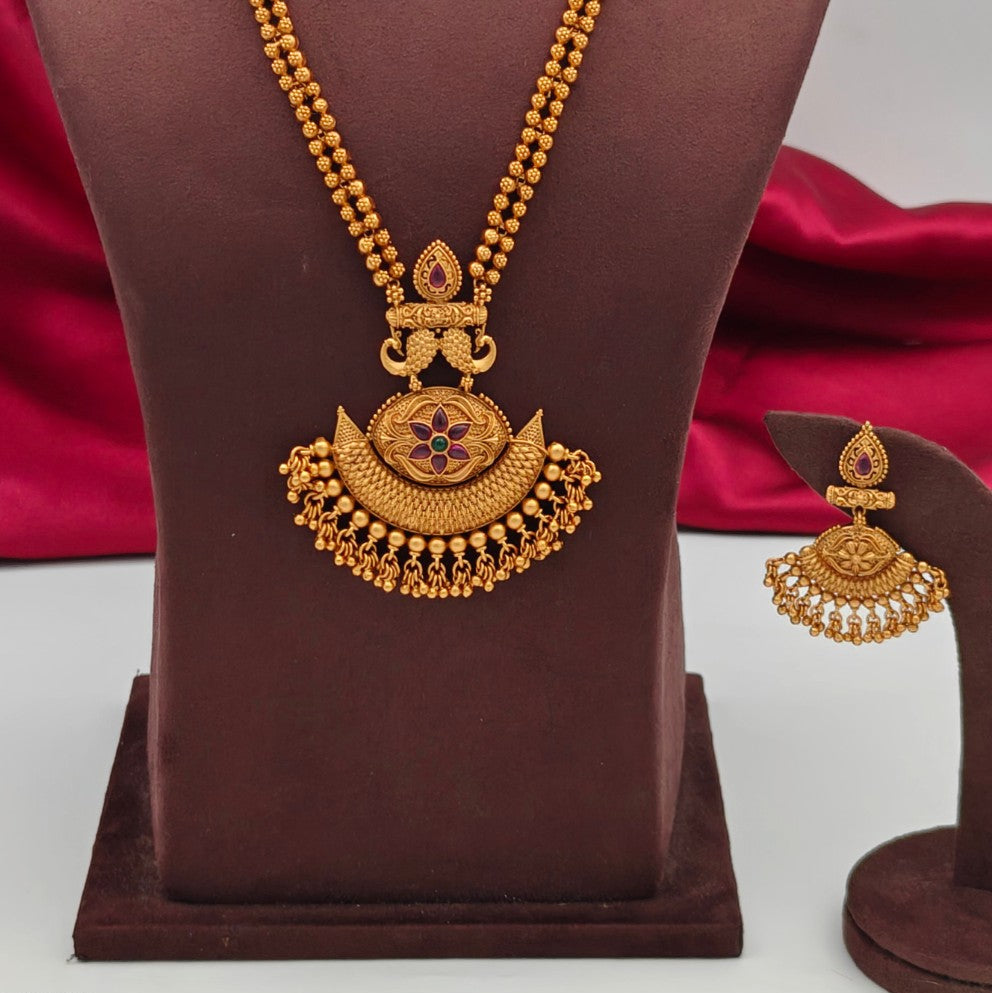 - Antique Non Idol Long Necklace Set features a Chandbali pattern and is crafted from high-quality brass metal, adorned with Kemp stones for a premium look.