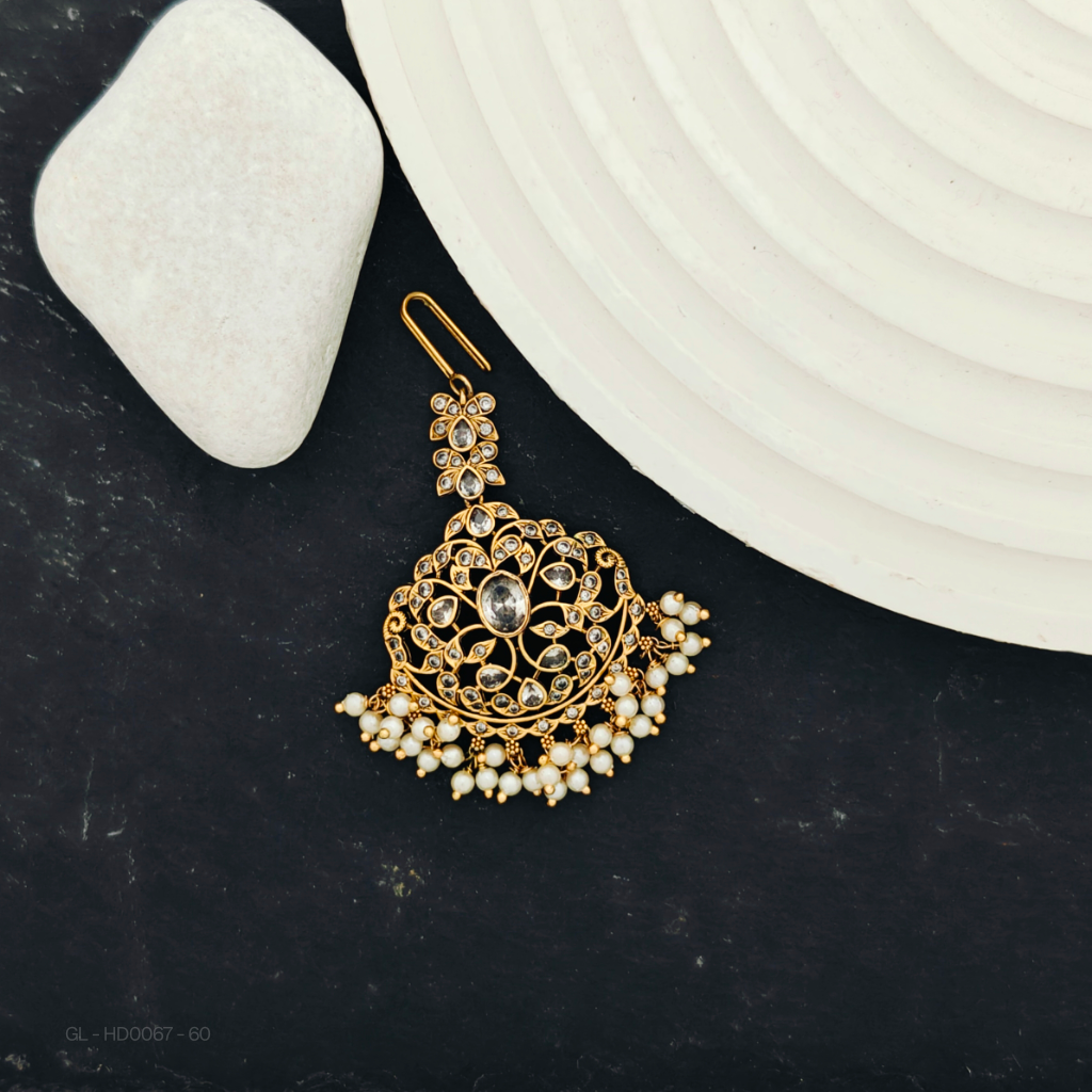 - The Tikka Head Accessory features a carefully crafted design, incorporating kemp stones, pearls, and a gold finish.