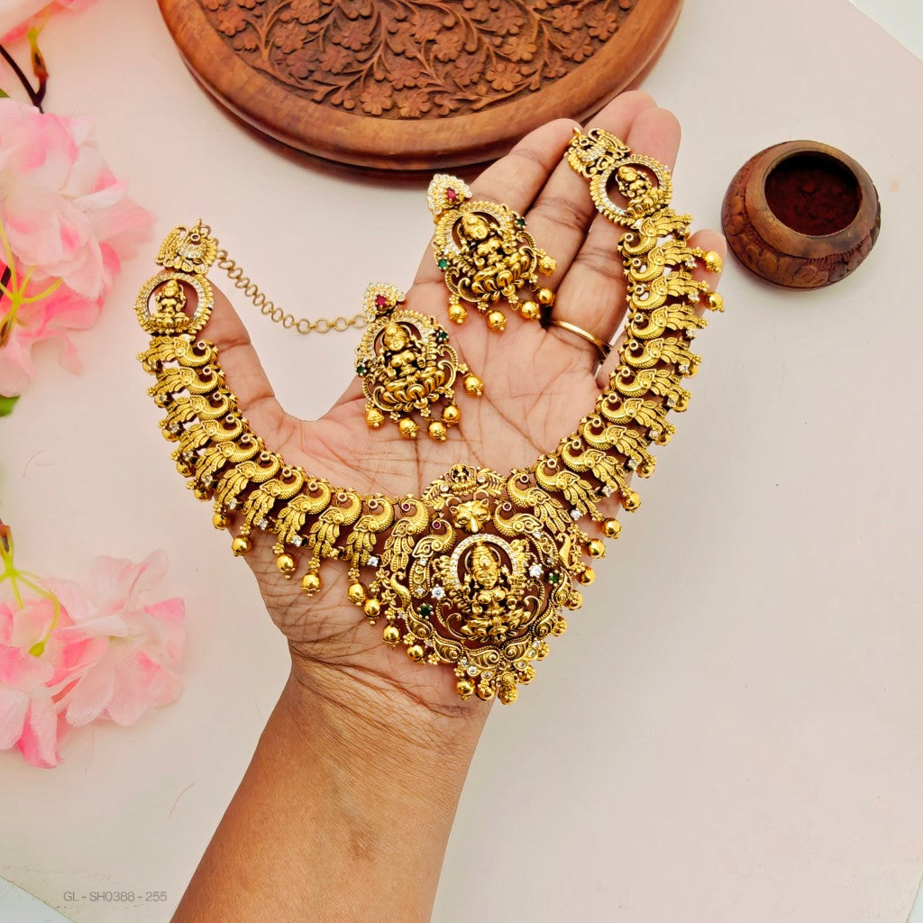 - Expertly crafted with an antique gold finish peacock ensemble Nakshi necklace features a stunning peacock motif and with a Lakshmi at the center & gold beads.