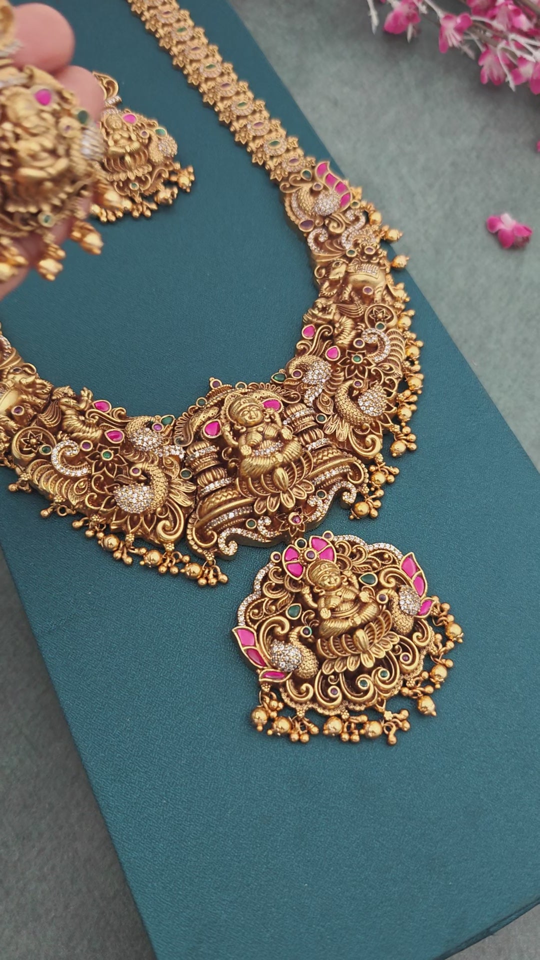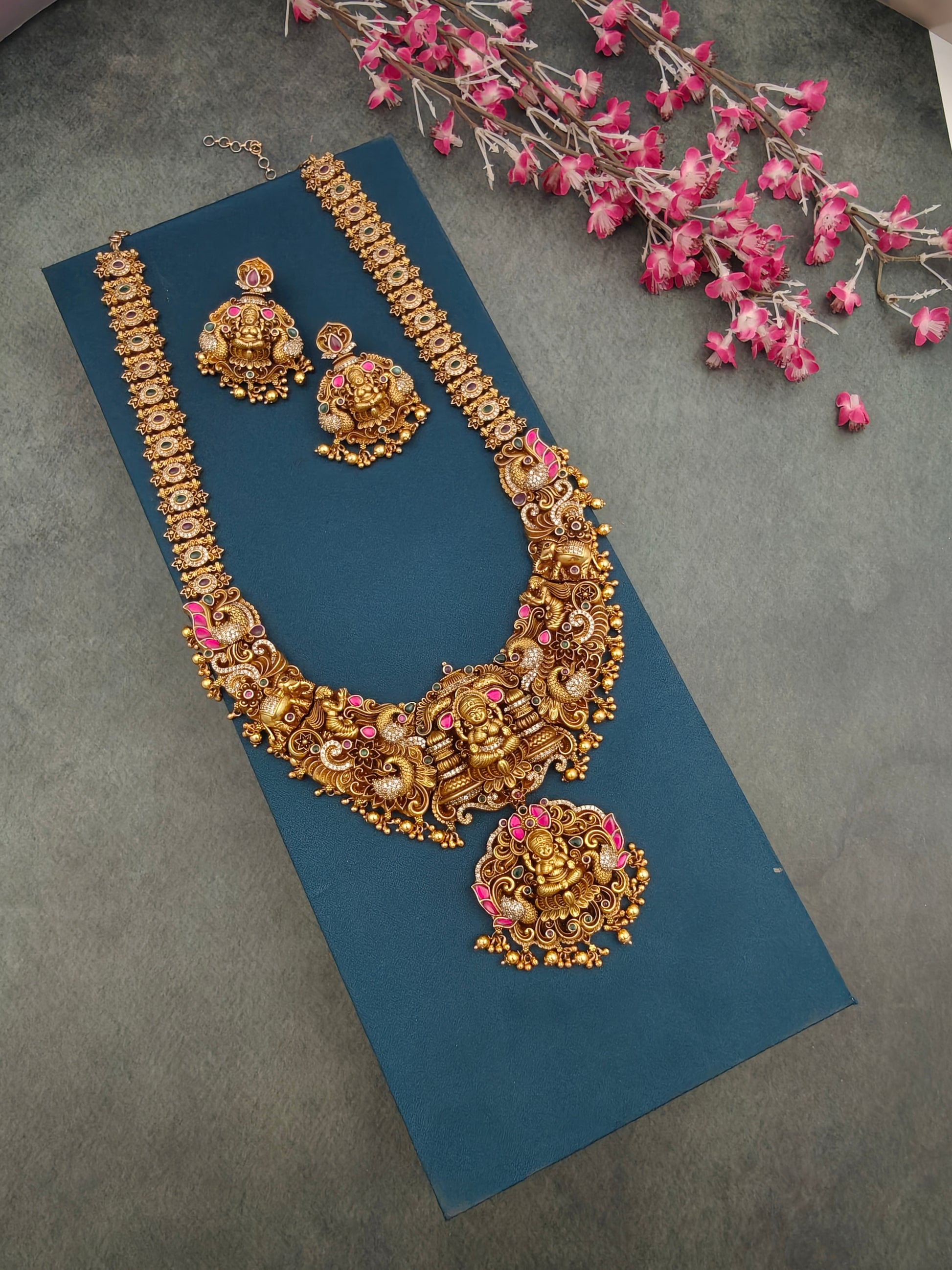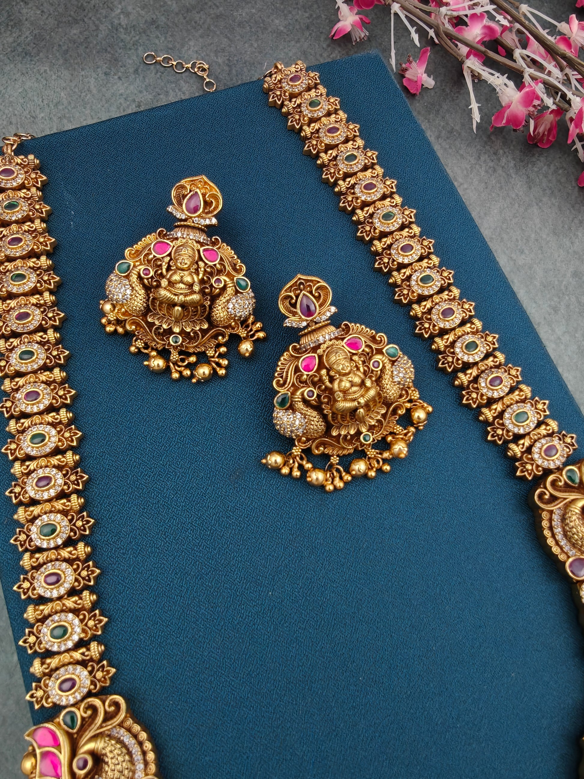 Expertly crafted with a premium gold finish and jadau kundan Semiprecious stones, this long necklace set features a traditional lakshmi design adorned with dancing peacock perfect for any bride.