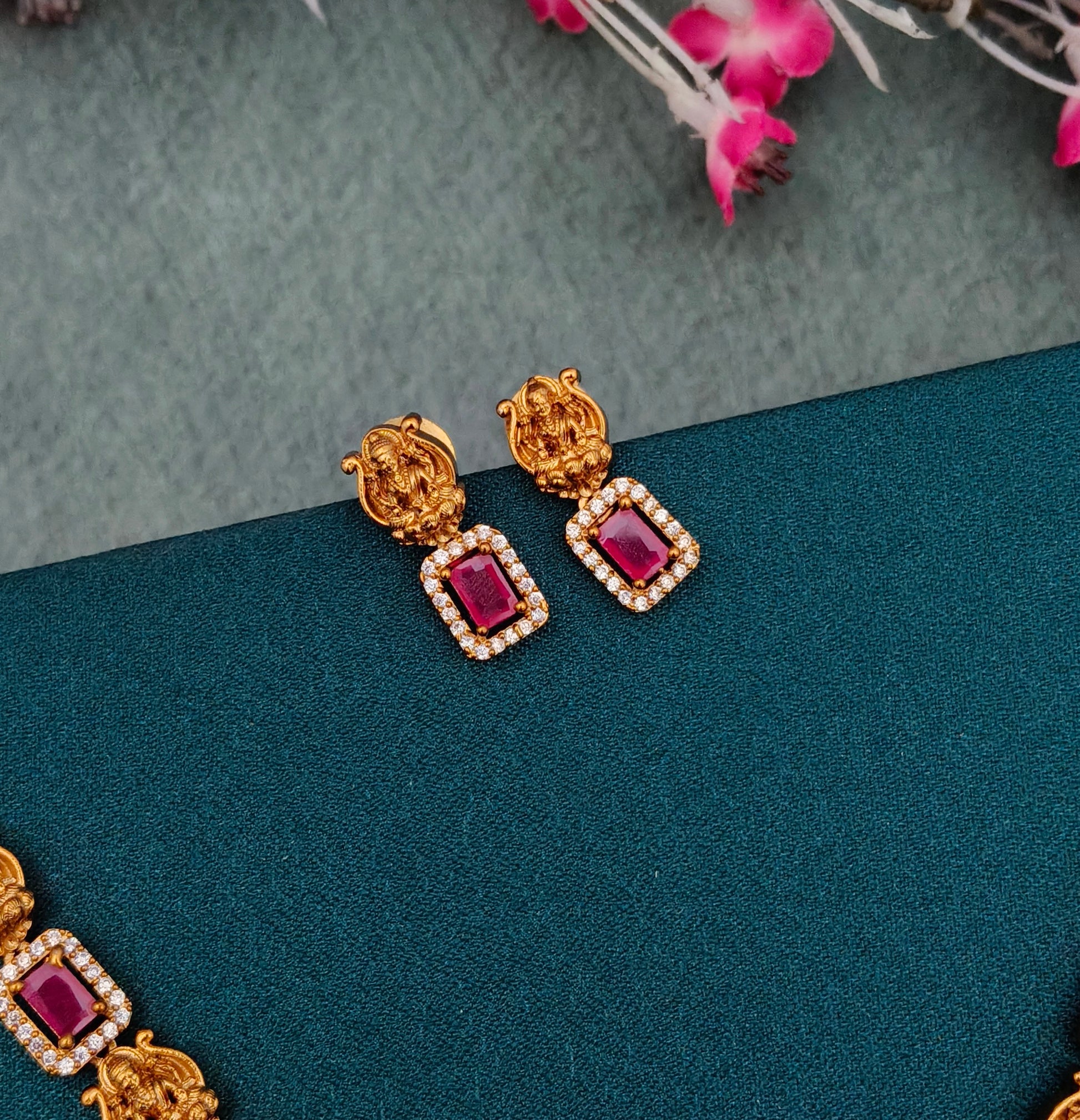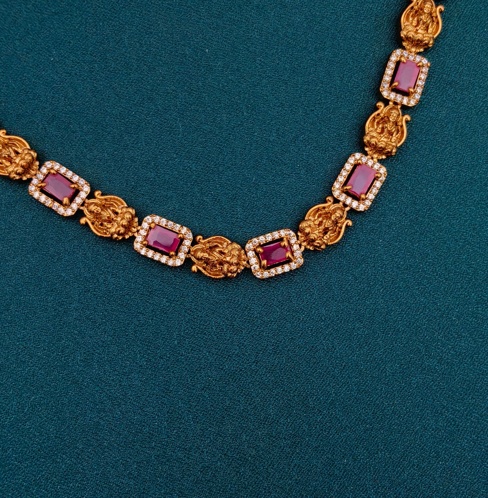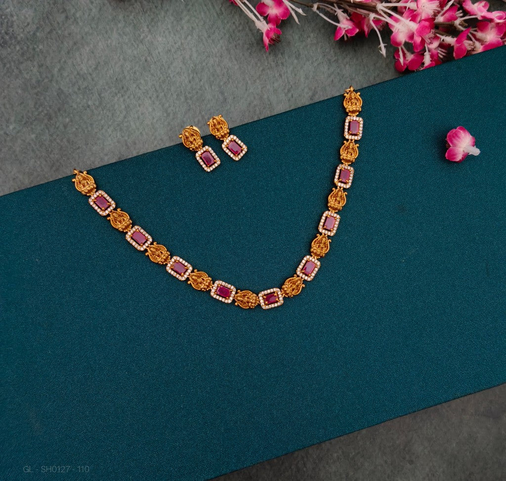 This exquisite necklace set features an antique gold finish and a beautiful ruby stone, all at an affordable price. Perfect for those looking for a budget-friendly yet elegant option.
