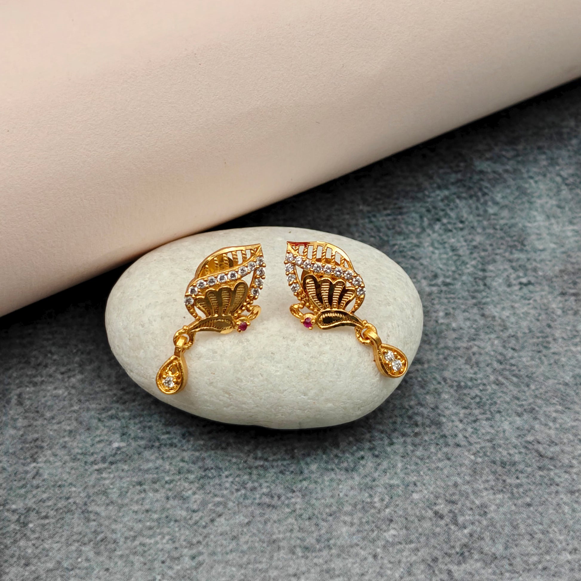 This is a gold-toned imitation jewelry set featuring a butterfly pendant with intricate cutwork and matching drop earrings.