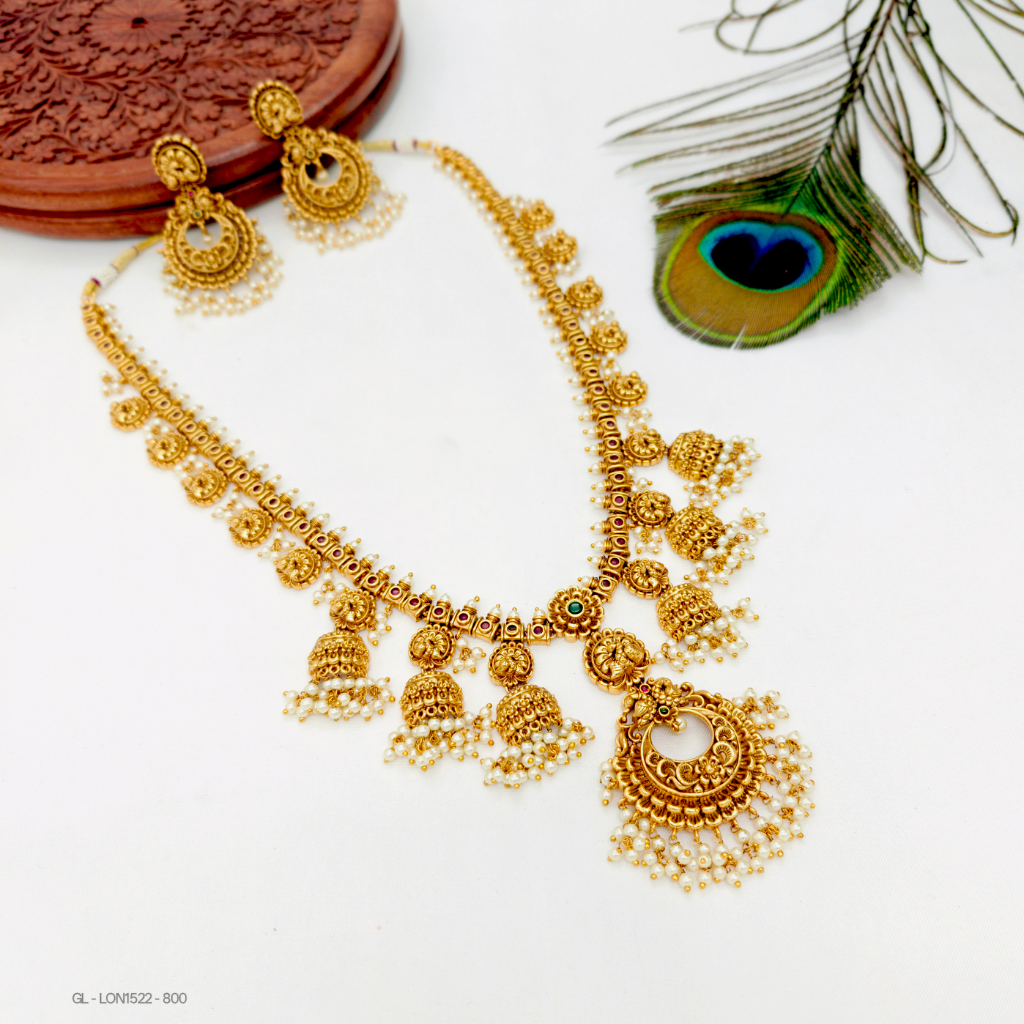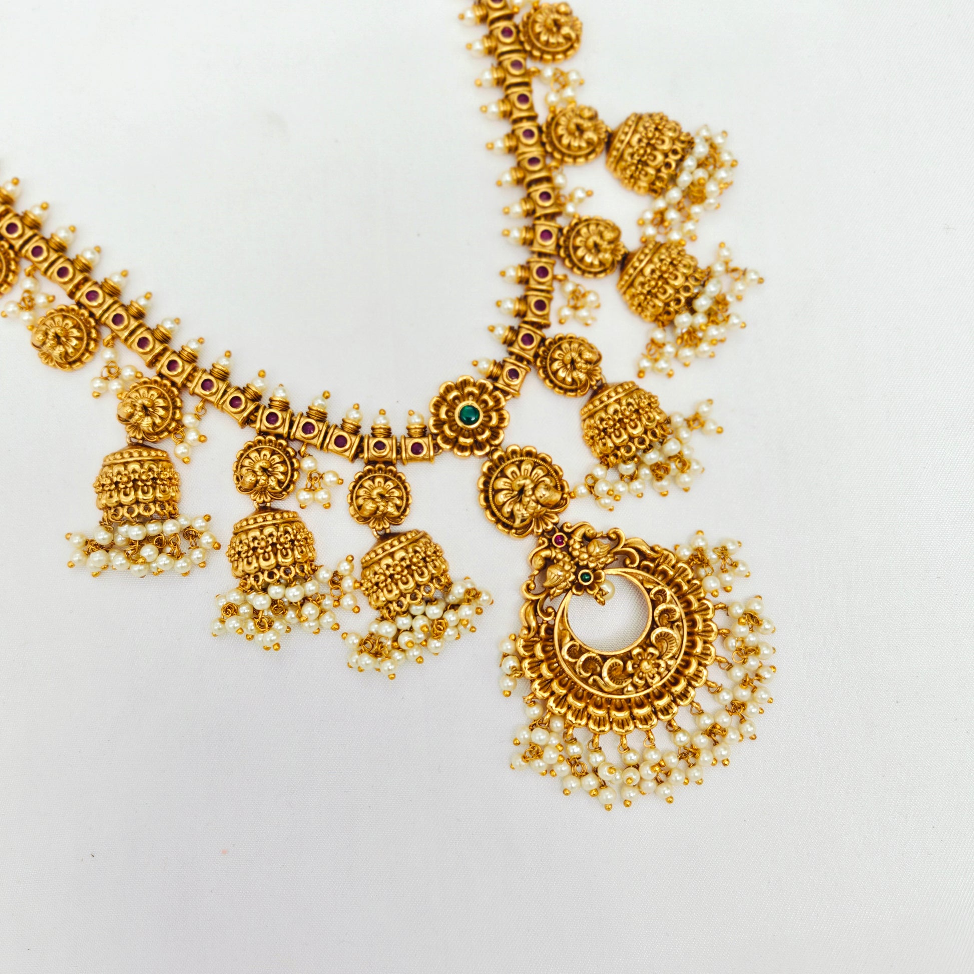 - This Chandbali clustered guttapusalu Haaram Set features a matt gold finish and includes long beaded hanging chains with matching earrings.