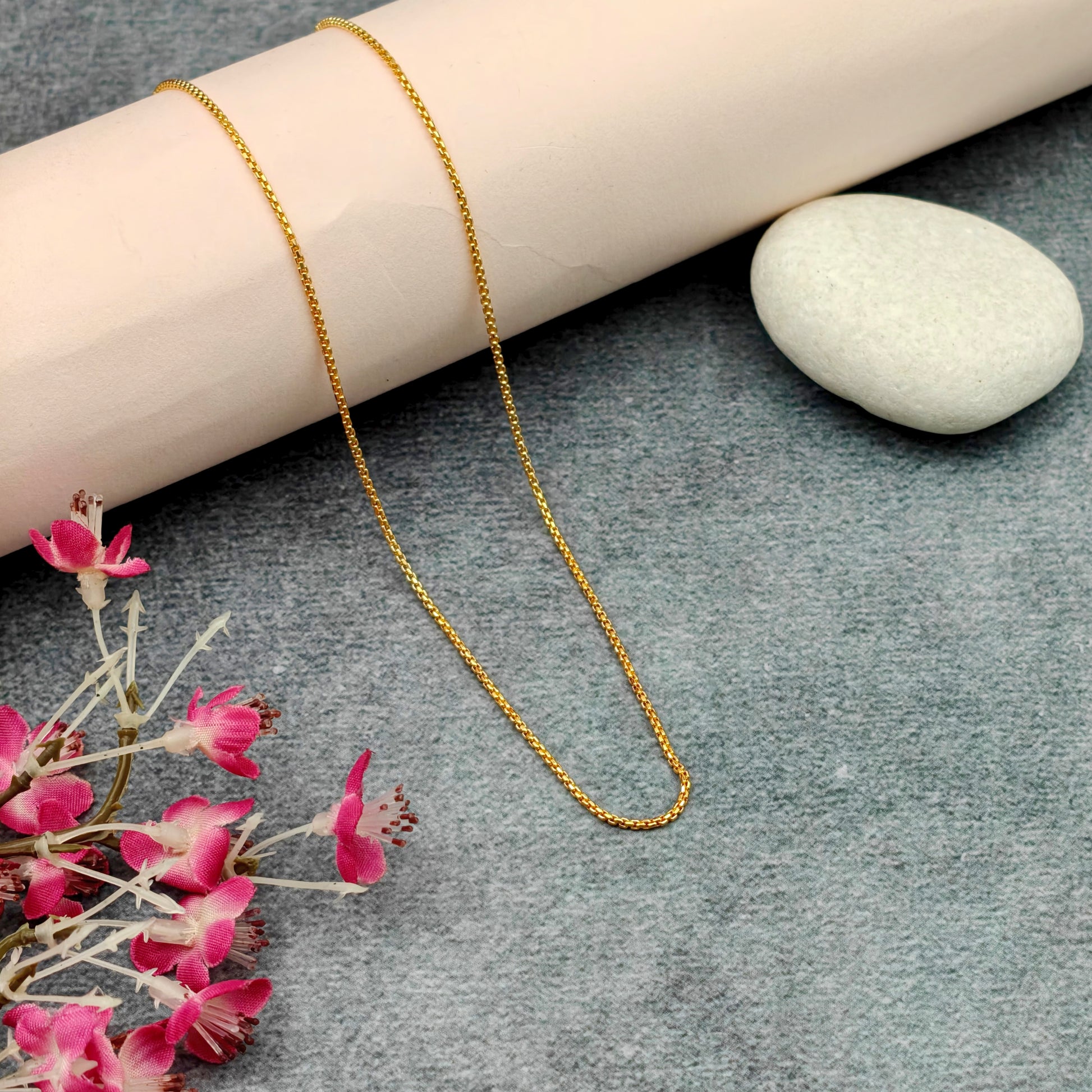 This is a gold-polished fancy chain featuring small, tightly woven links, sometimes referred to as a fox tail or bead chain