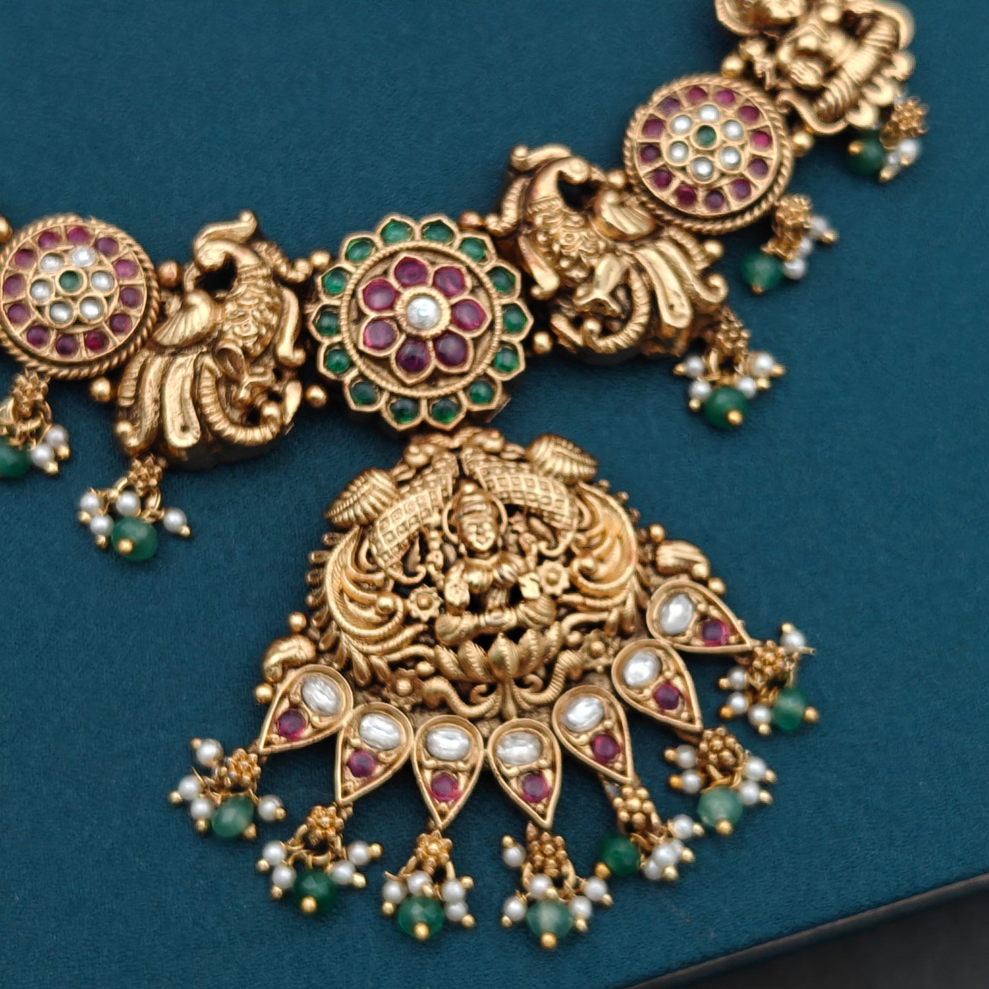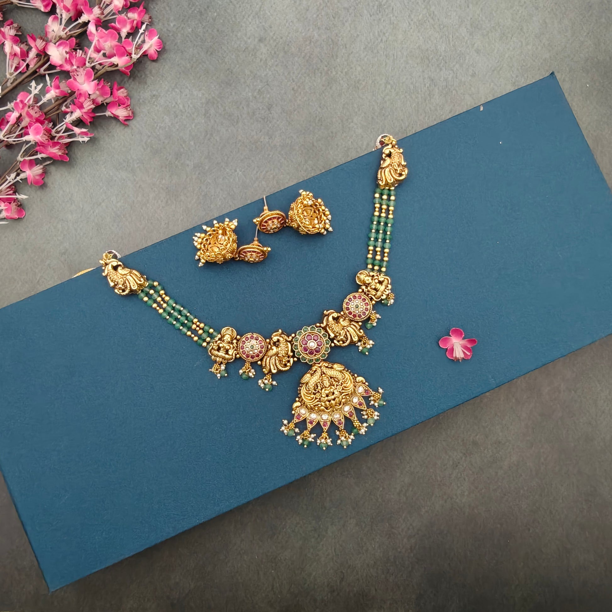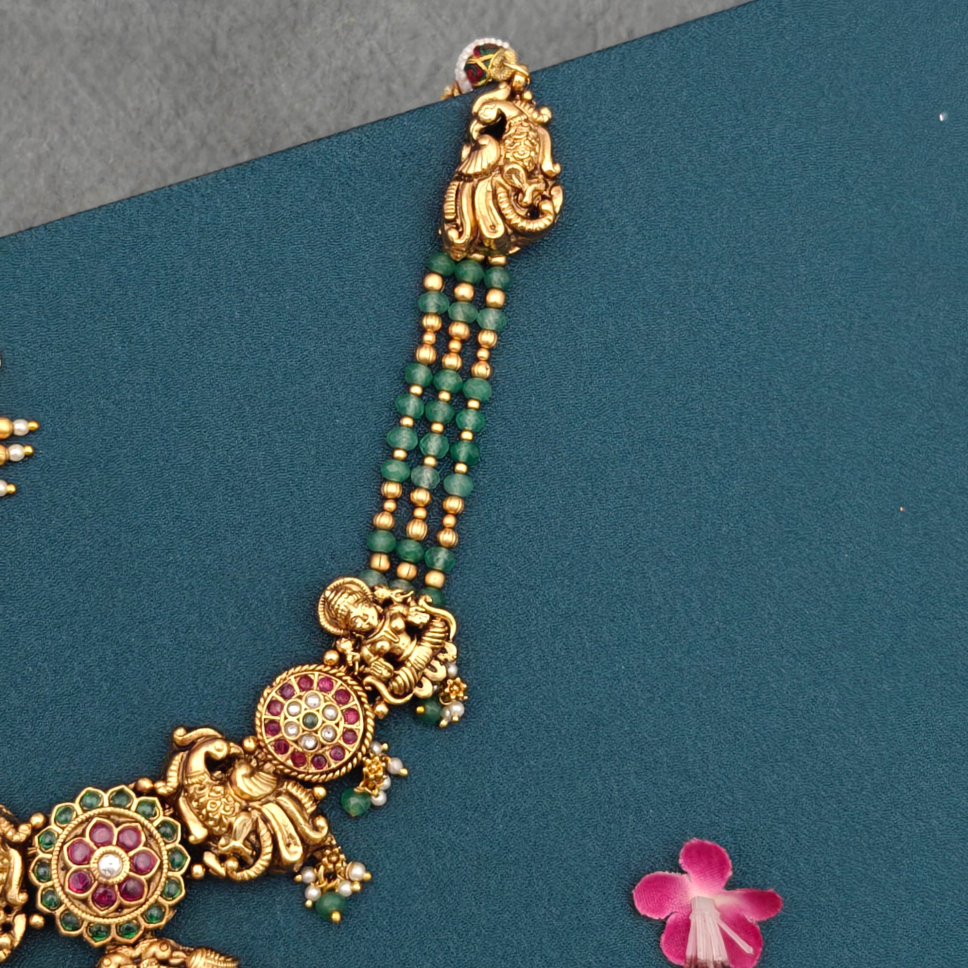 - This Temple necklace Set showcases a 3-line arrangement of chakra lakshmi beads in a lovely green hue.