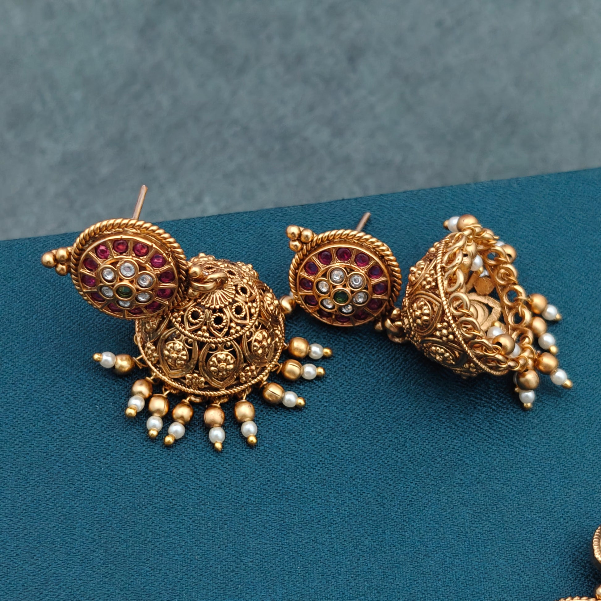 - The set is crafted in a traditional style, often referred to as ethnic jewelry, and has a matt gold finish.