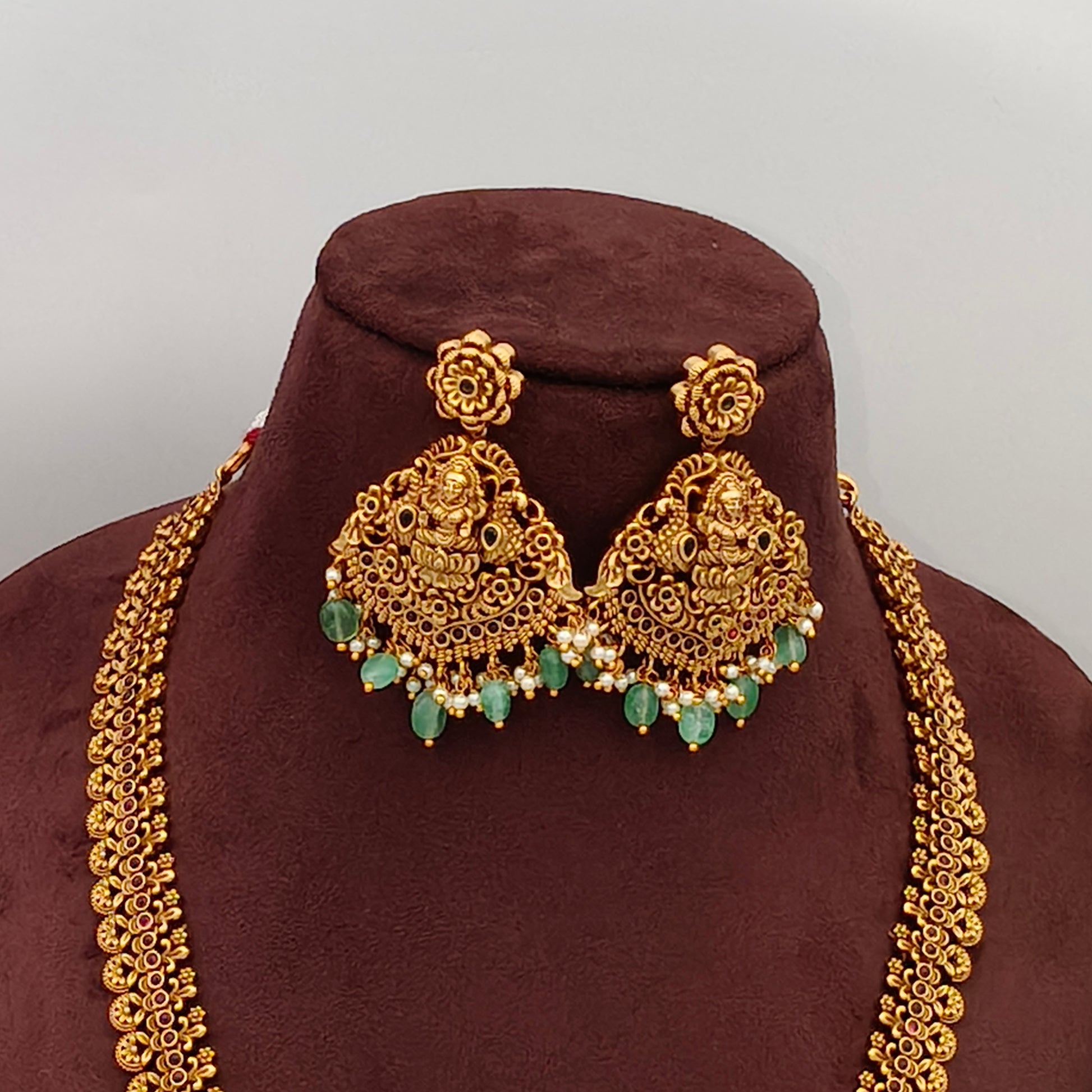 This temple set is designed with a traditional aesthetic, showcasing a gold Haaram look in dollar pattern Lakshmi.