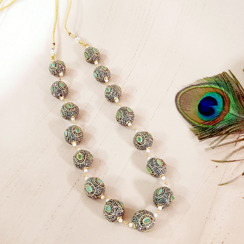 - The necklace features large, dark, spherical beads, each embellished with smaller green and white stones.