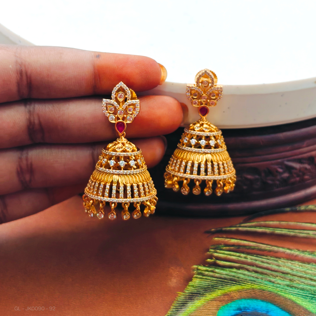 - These jhumkas feature a Cz Gold finish and are adorned with stone drops in a floral design.
