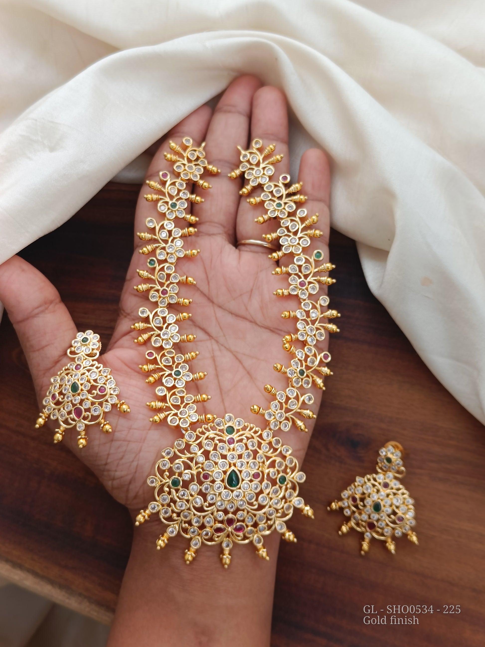 - This mid length necklace and earring set features a gold finish with white CZ and kemp stone accents.