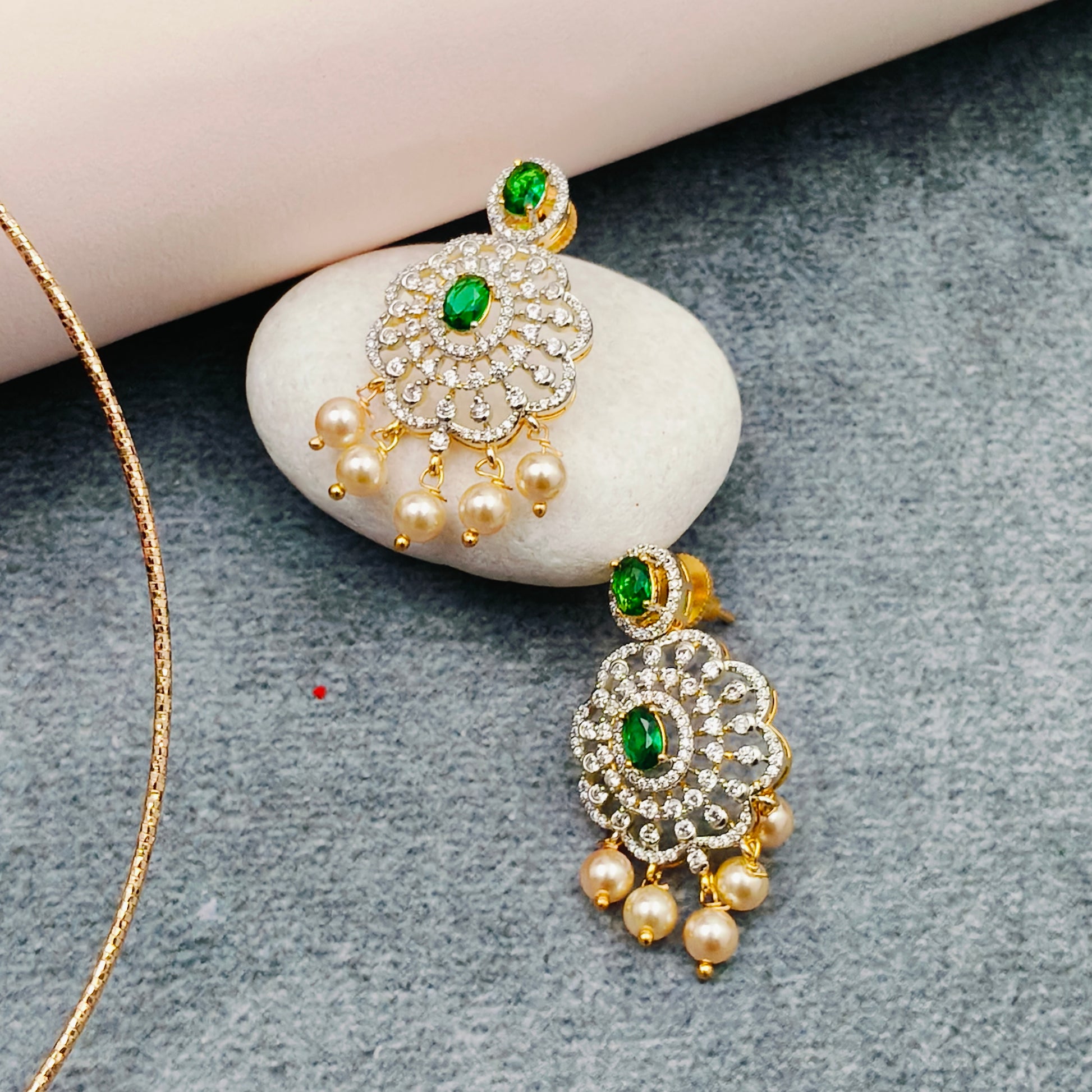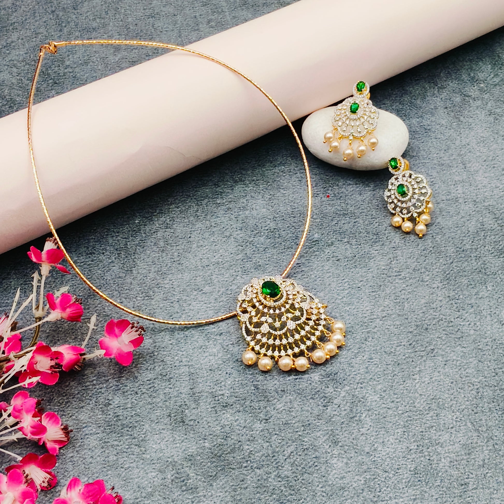This set features an elegant white stones with light gold finish with a striking Green center stone, accompanied by matching earrings.
