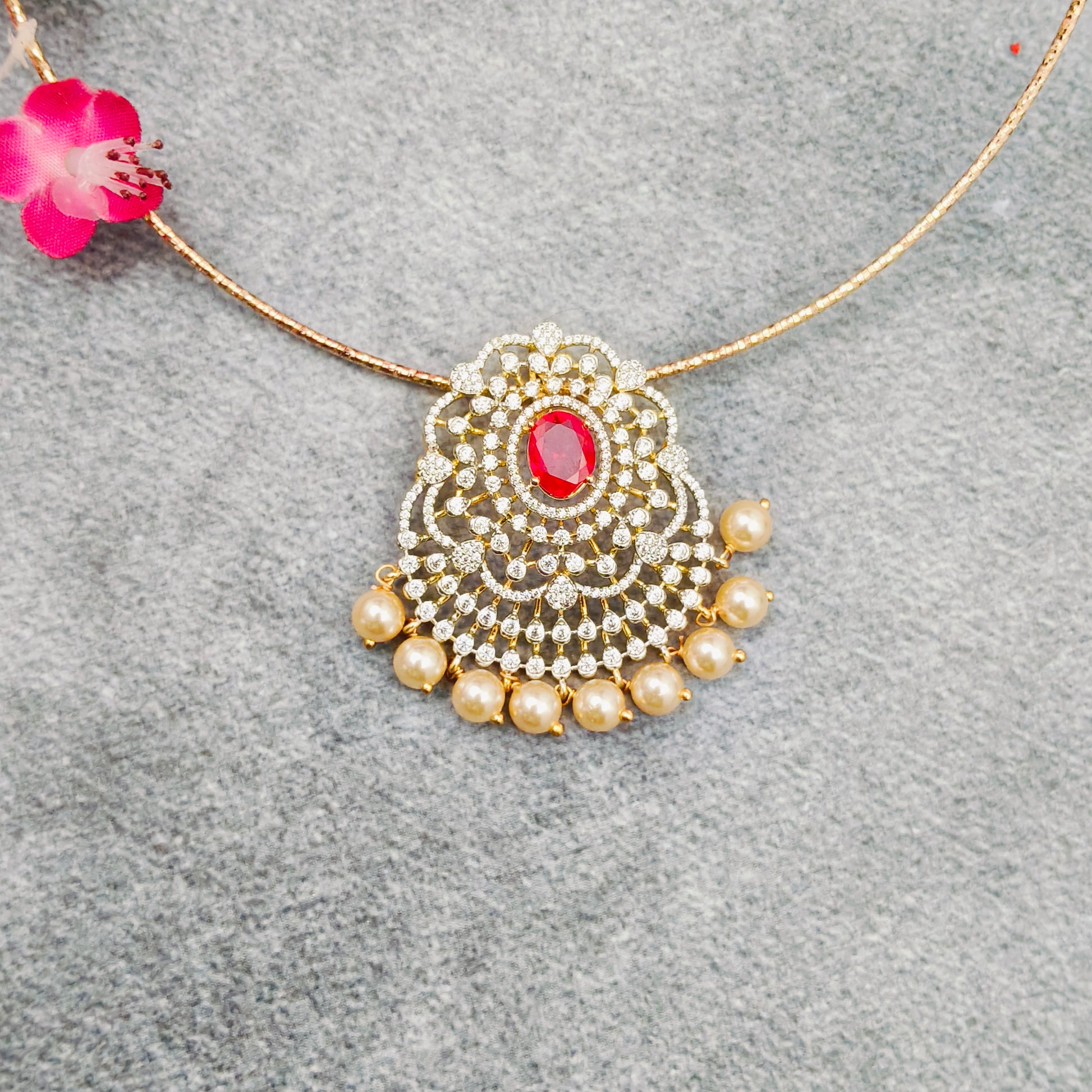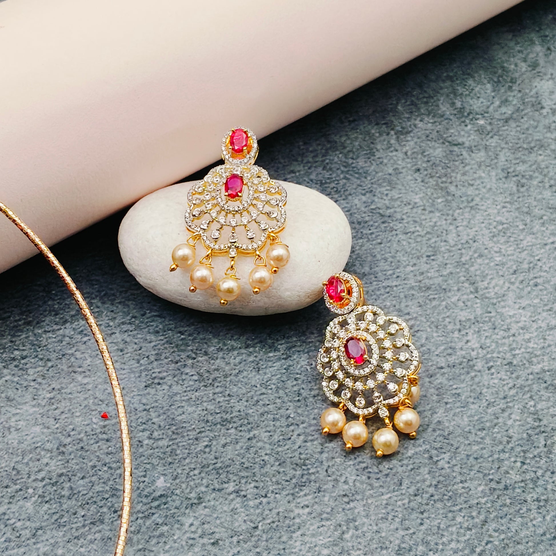 This set features an elegant white stones with light gold finish with a striking Red center stone, accompanied by matching earrings.