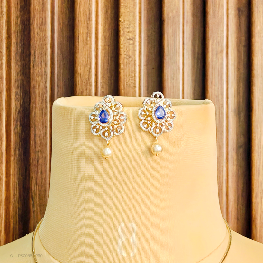 This set features an elegant white stones with light gold finish with a striking Purple centered stone, accompanied by matching earrings.