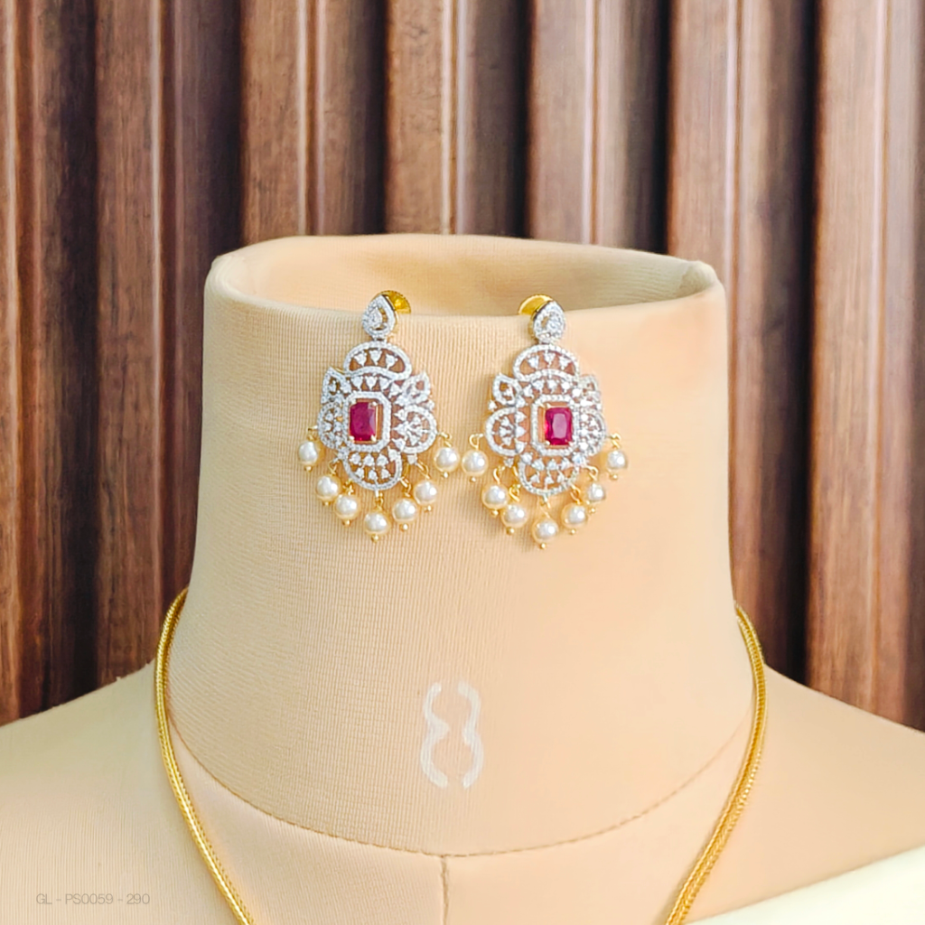 This set features an elegant white stones with light gold finish with a striking Purple centered stone, accompanied by matching earrings.