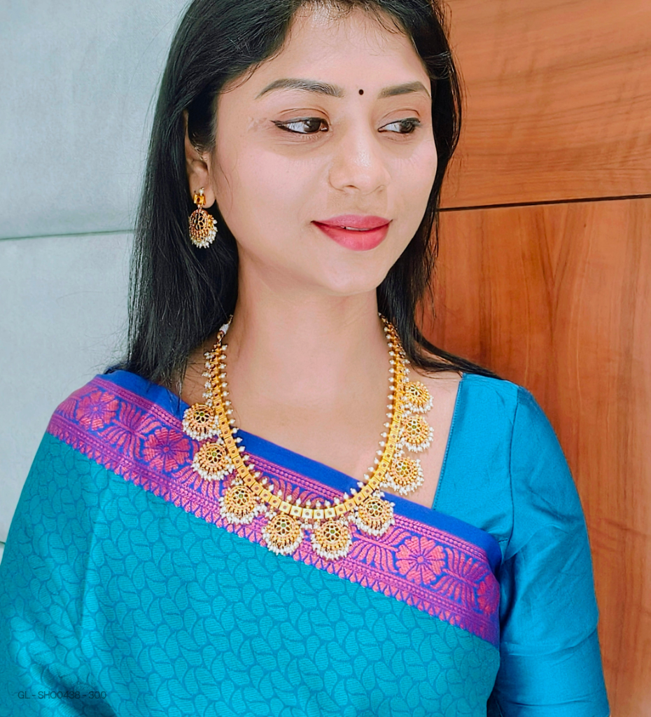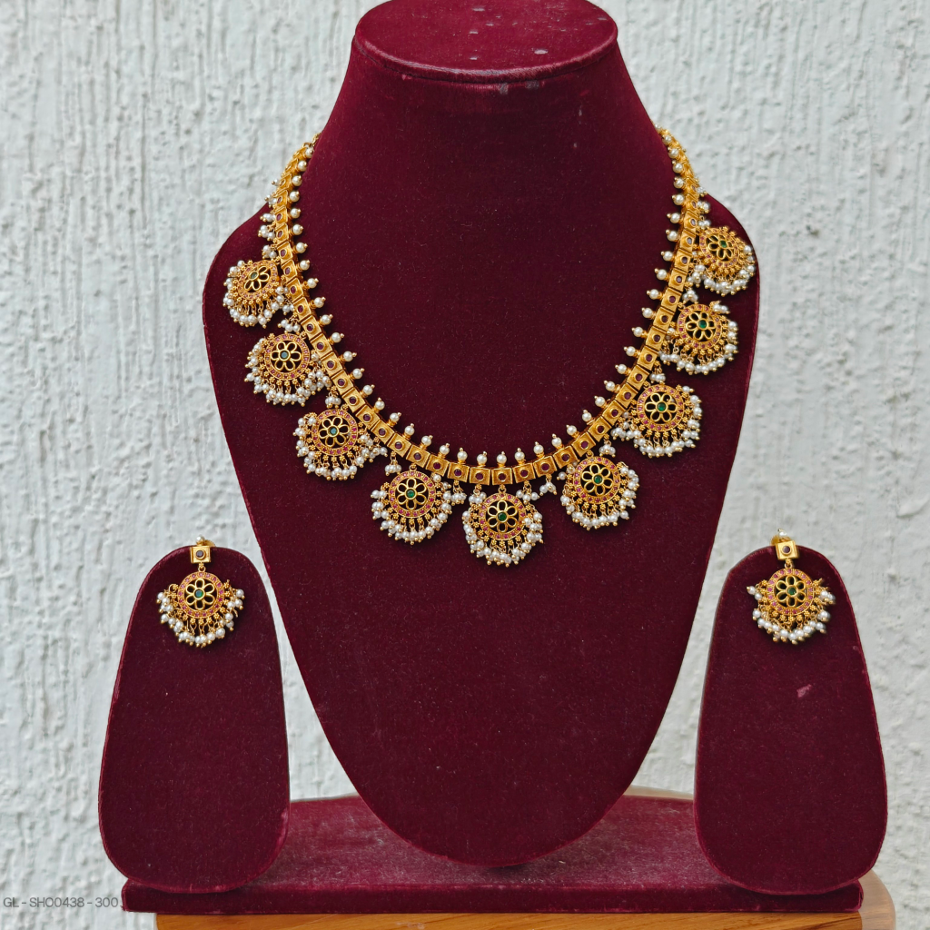 - Floral Guttapusalu - Mid Length features a Matt Gold finish adorned with Cz Ruby Green Stones and a beautiful floral pattern, making it the perfect accessory for any occasion.