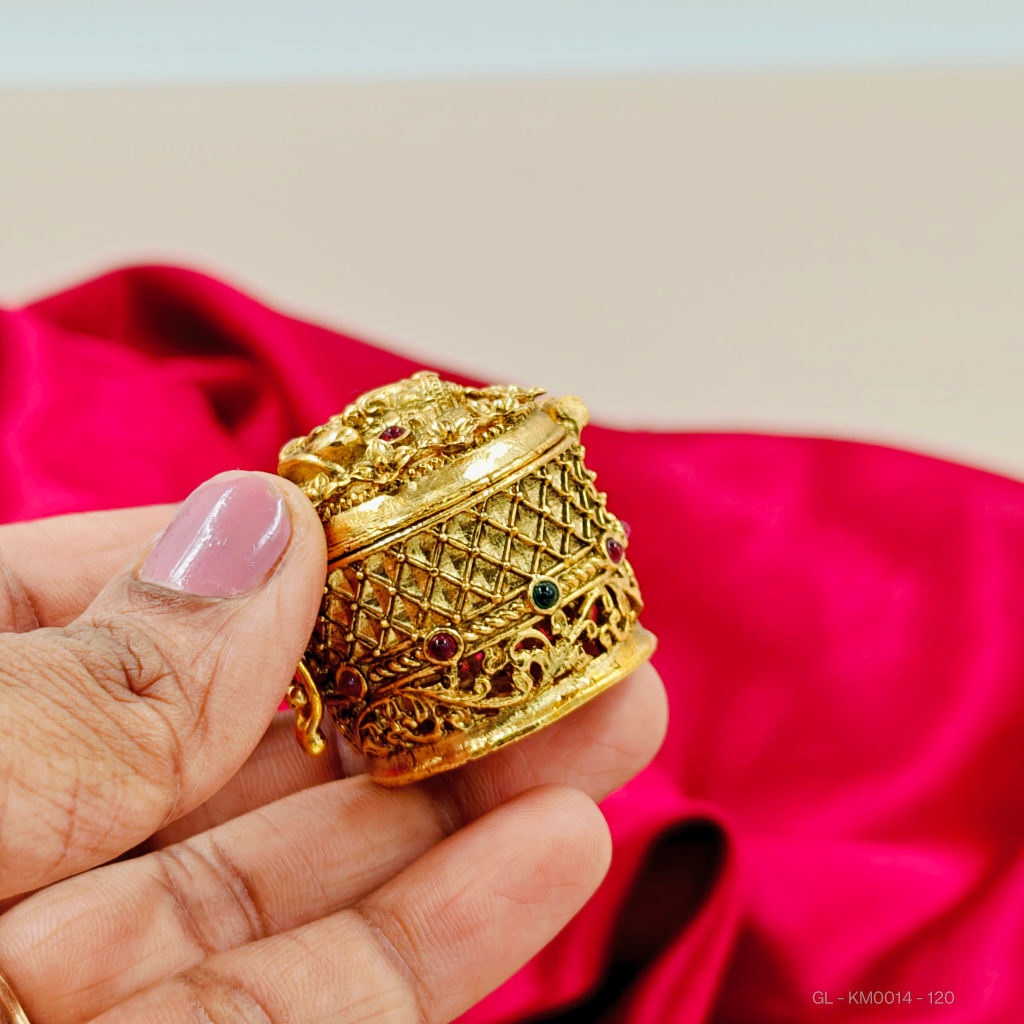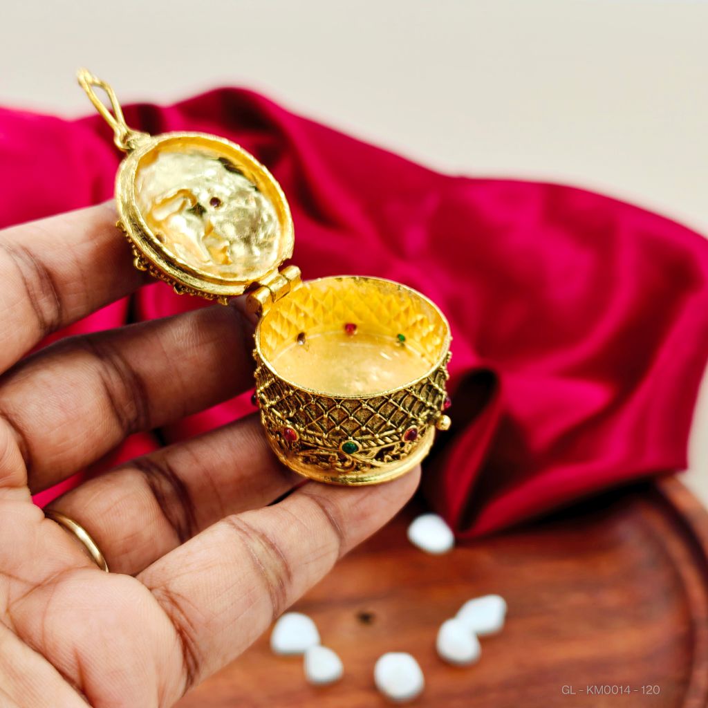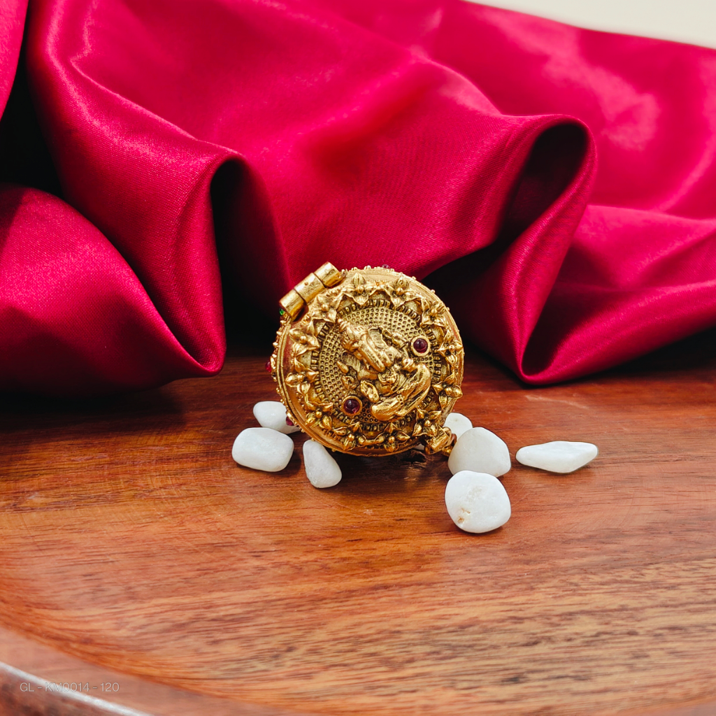 - This ganesh kumkum container is crafted from gold-toned metal and adorned with red and green stones. Designed for traditional or pooja use, it provides an elegant and secure place to store kumkum powder.