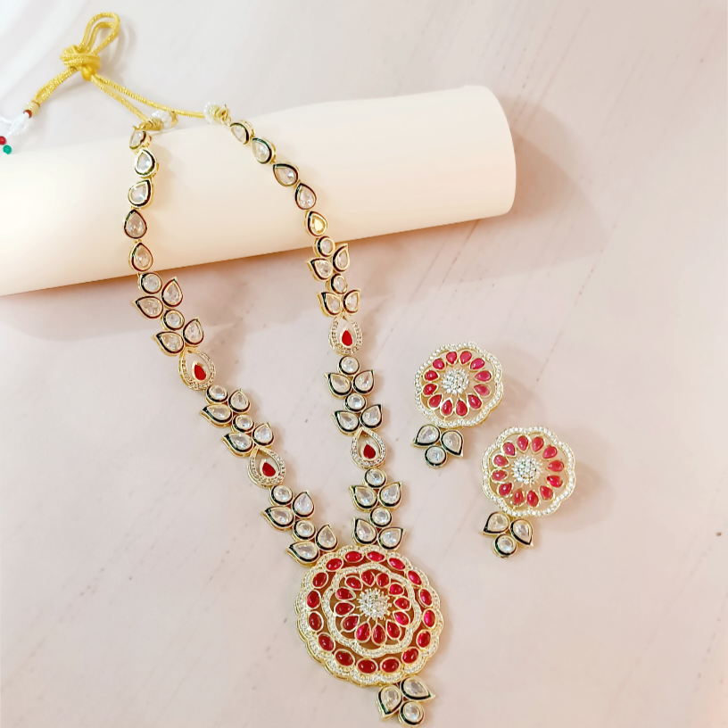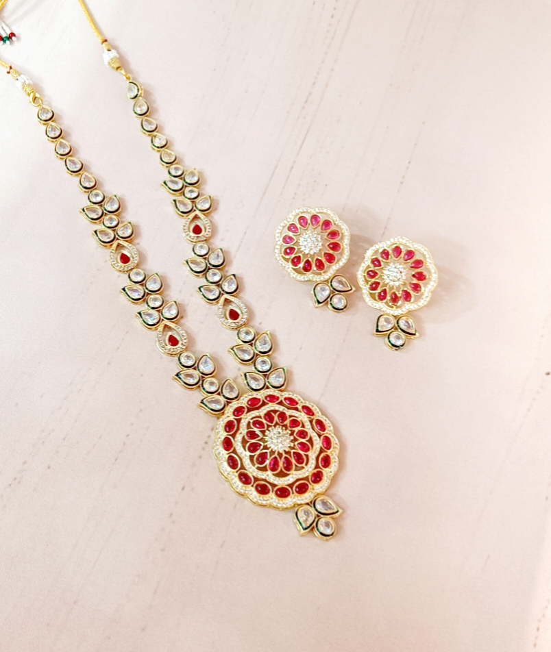 - The earrings are large studs that mirror the pendant's floral motif and include a small dangling element at the bottom.