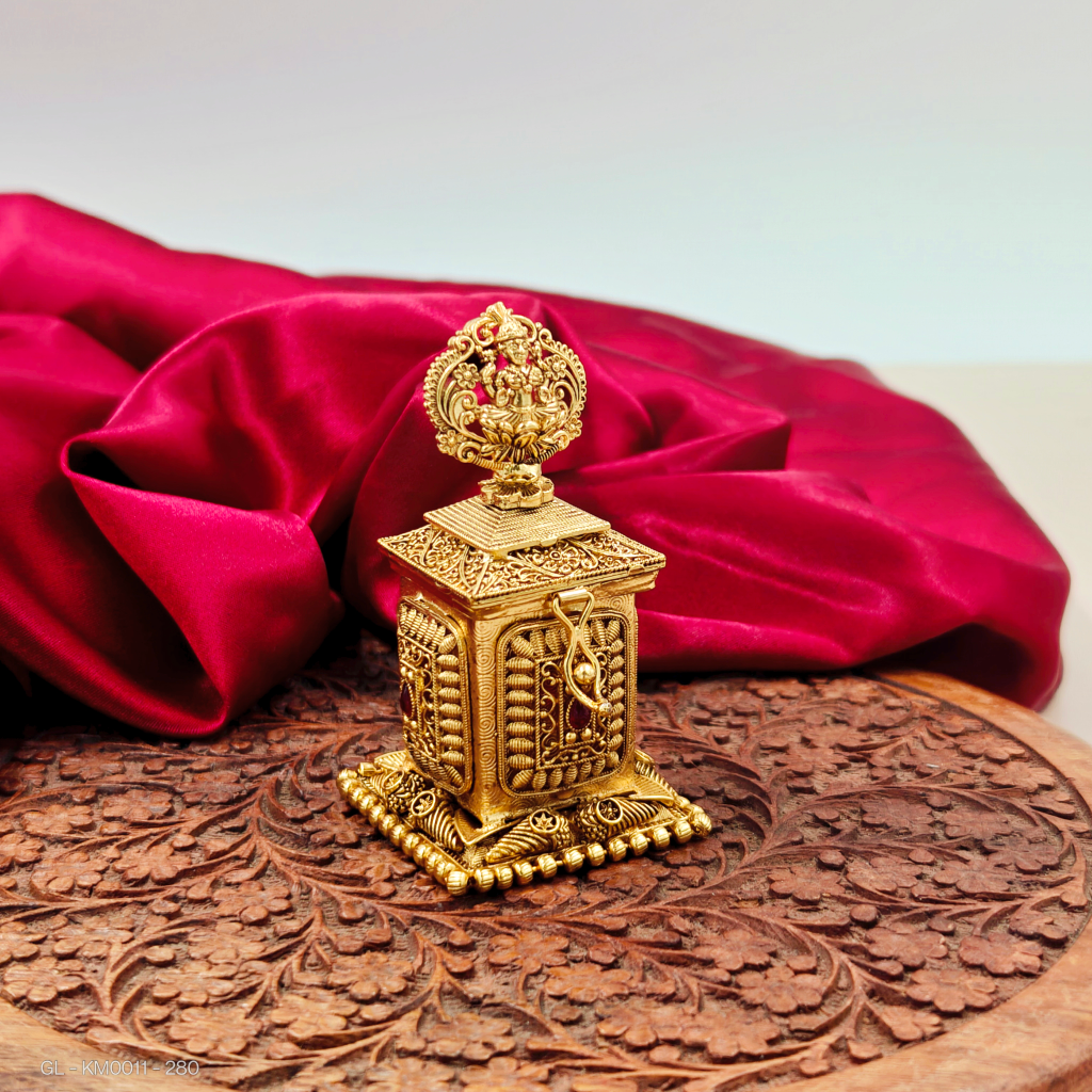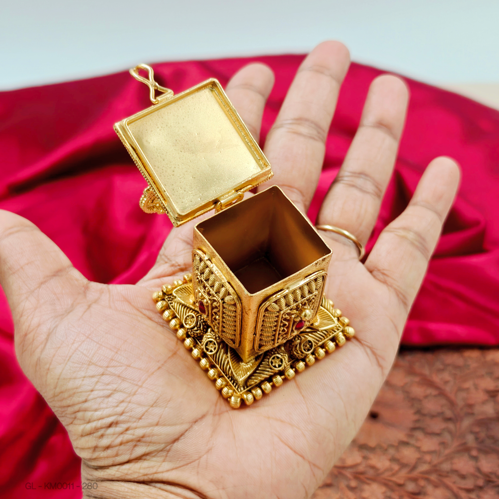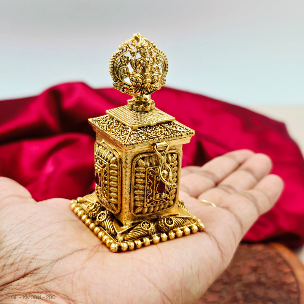 - This kumkum box has a gold-like finish with God Lakshmi with Lotus and AD stones. Made from imitation materials, it offers a traditional temple style for storing kumkum.