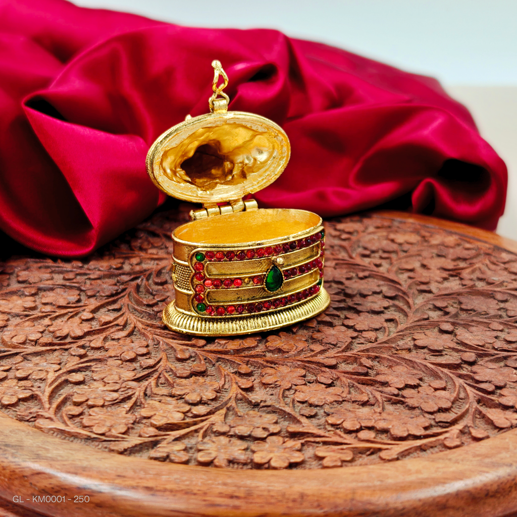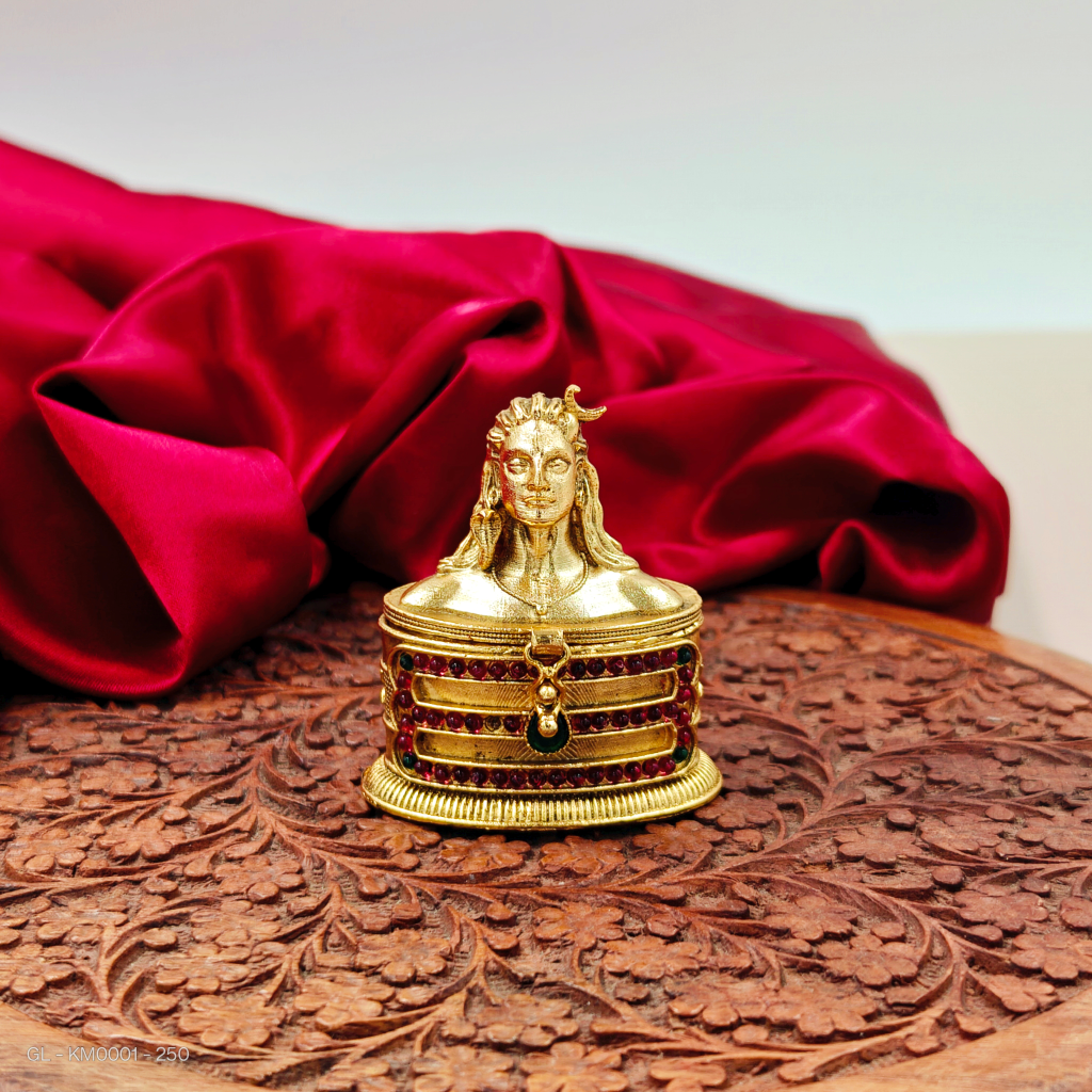 - This kumkum box has a gold-like finish with lord shiva face and AD stones. Made from imitation materials, it offers a traditional temple style for storing kumkum.