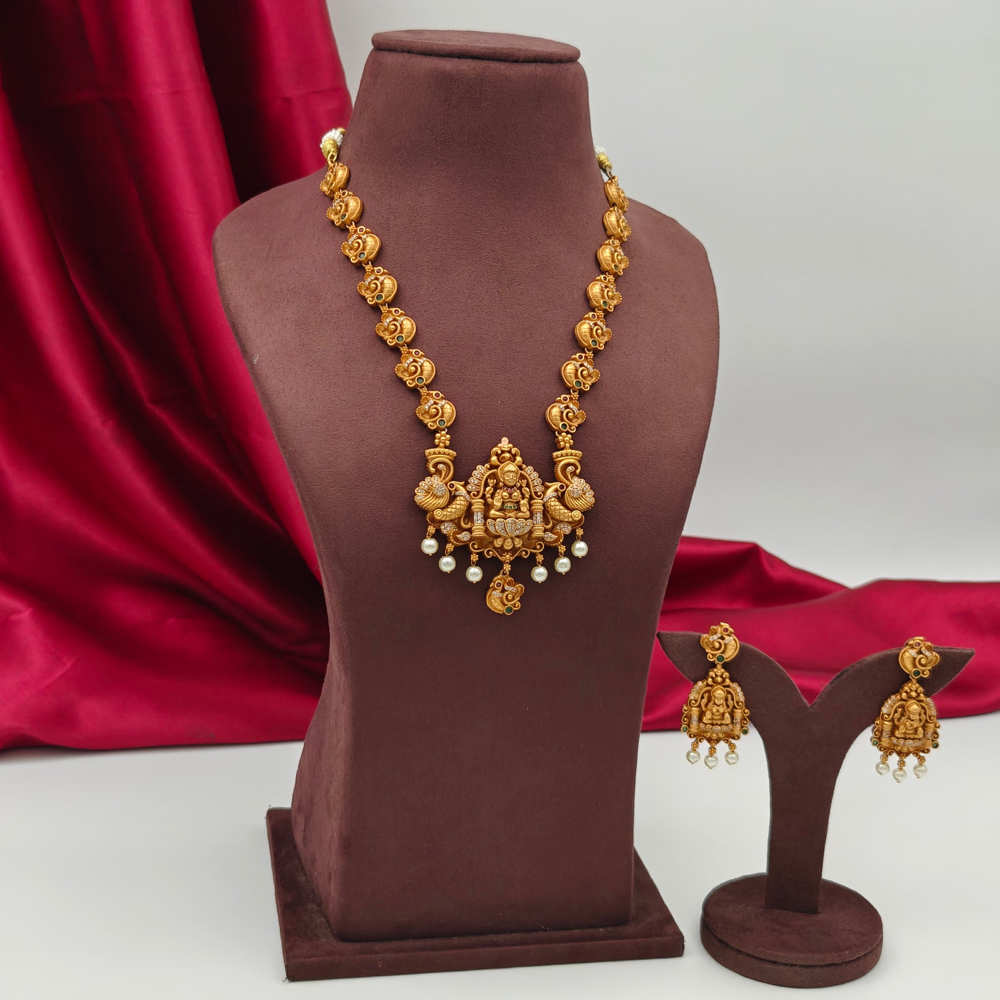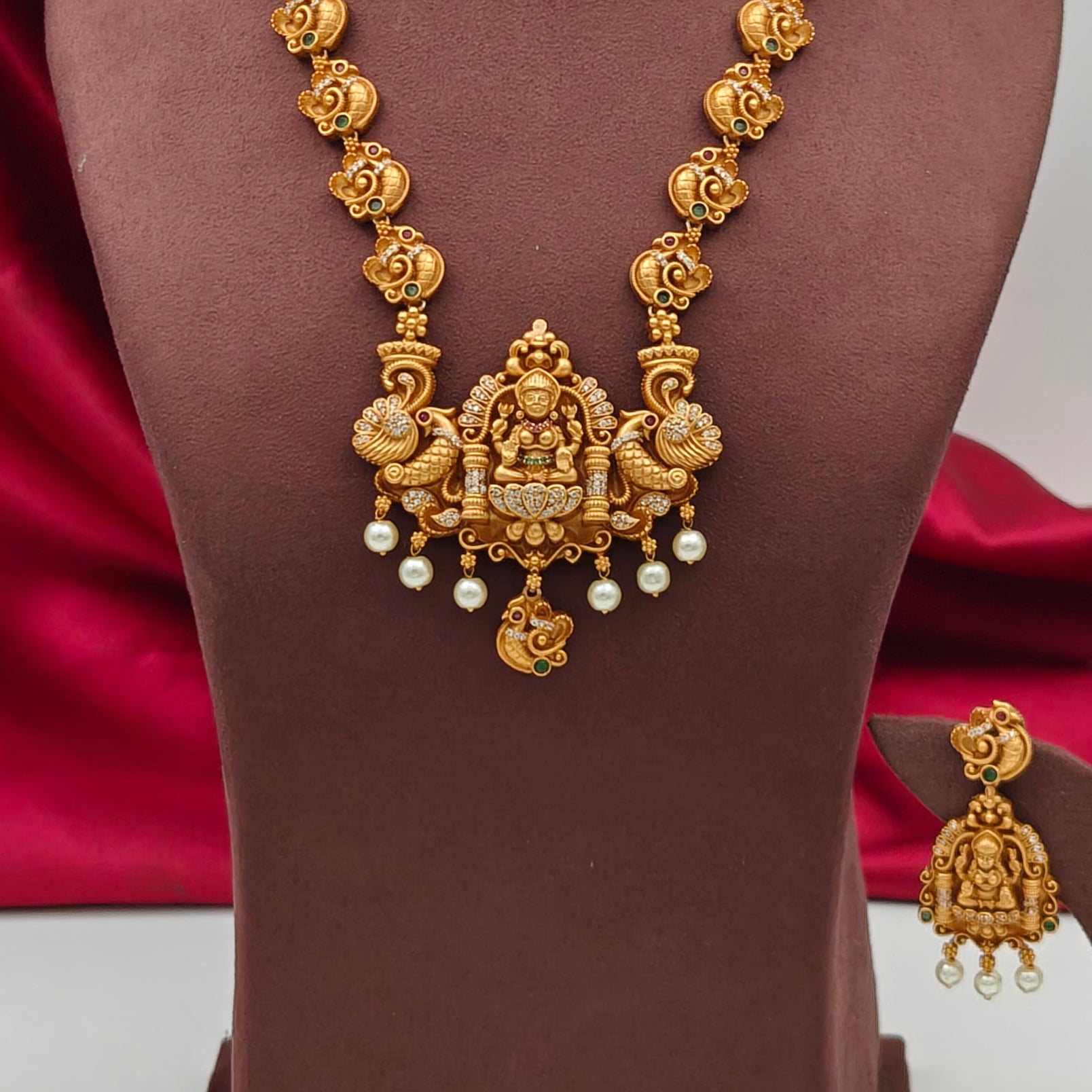 - The necklace features a prominent central pendant with a deity, likely Goddess Lakshmi, surrounded by intricate designs that include peacock motifs and pearls.