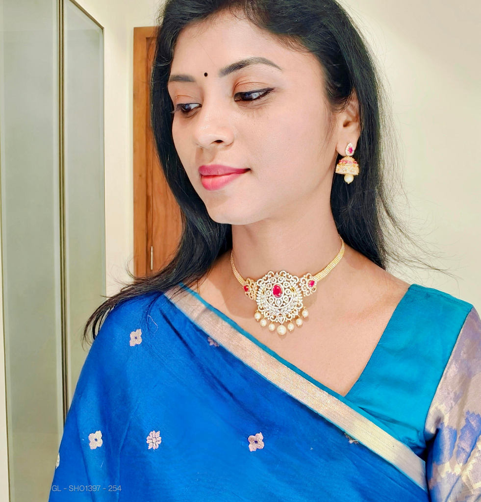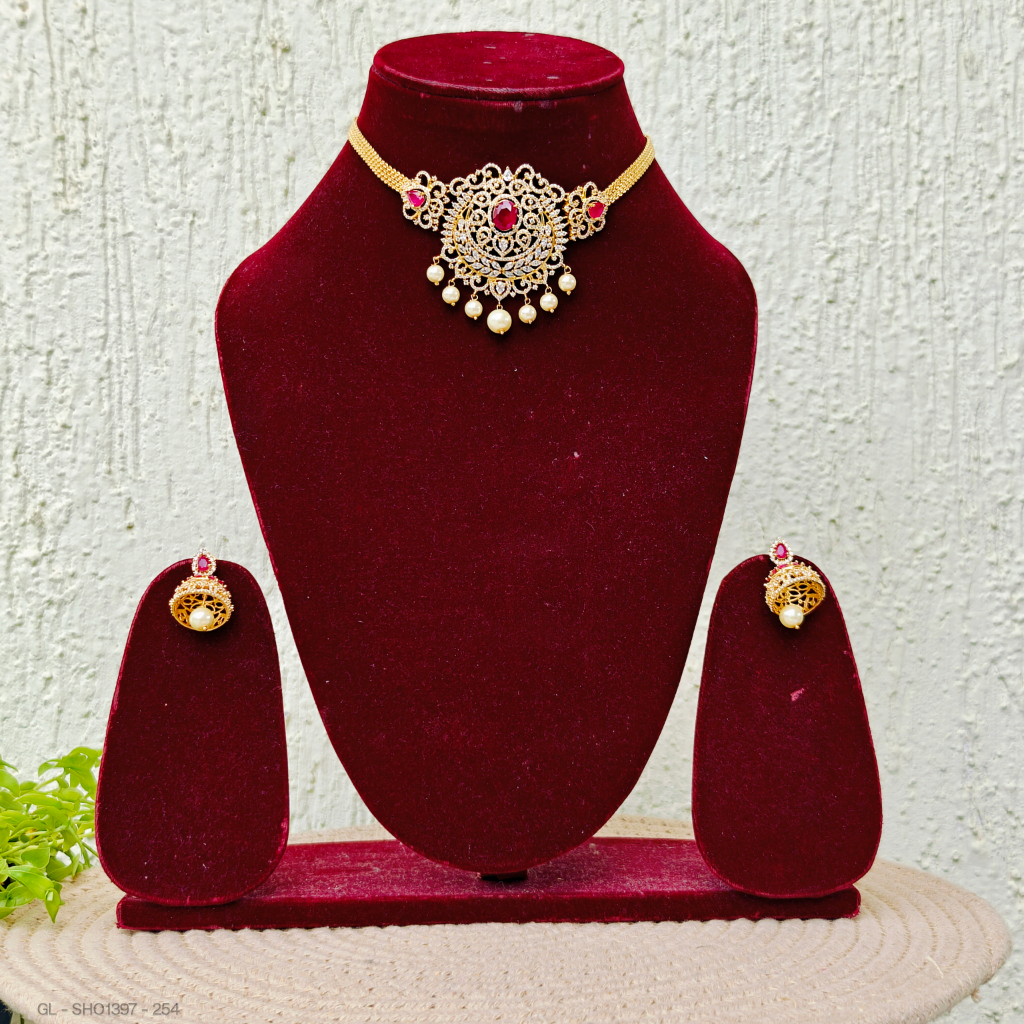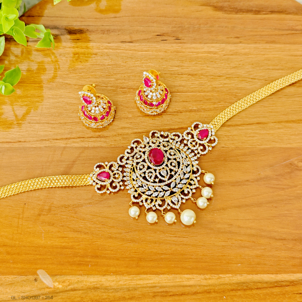 The Gold Finish AD Emerald Simple Elegant Choker Necklace Set includes a Chandbali design pendant with a Pearl Hanging and Stone Jhmukas, all in a beautiful ruby color.