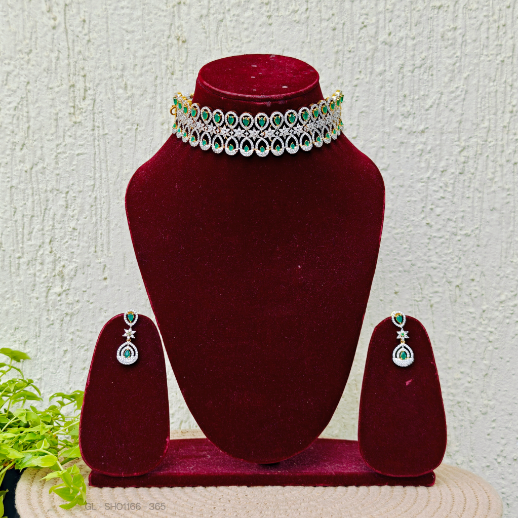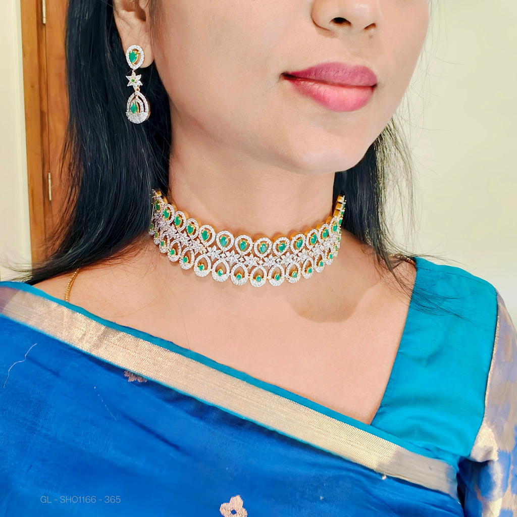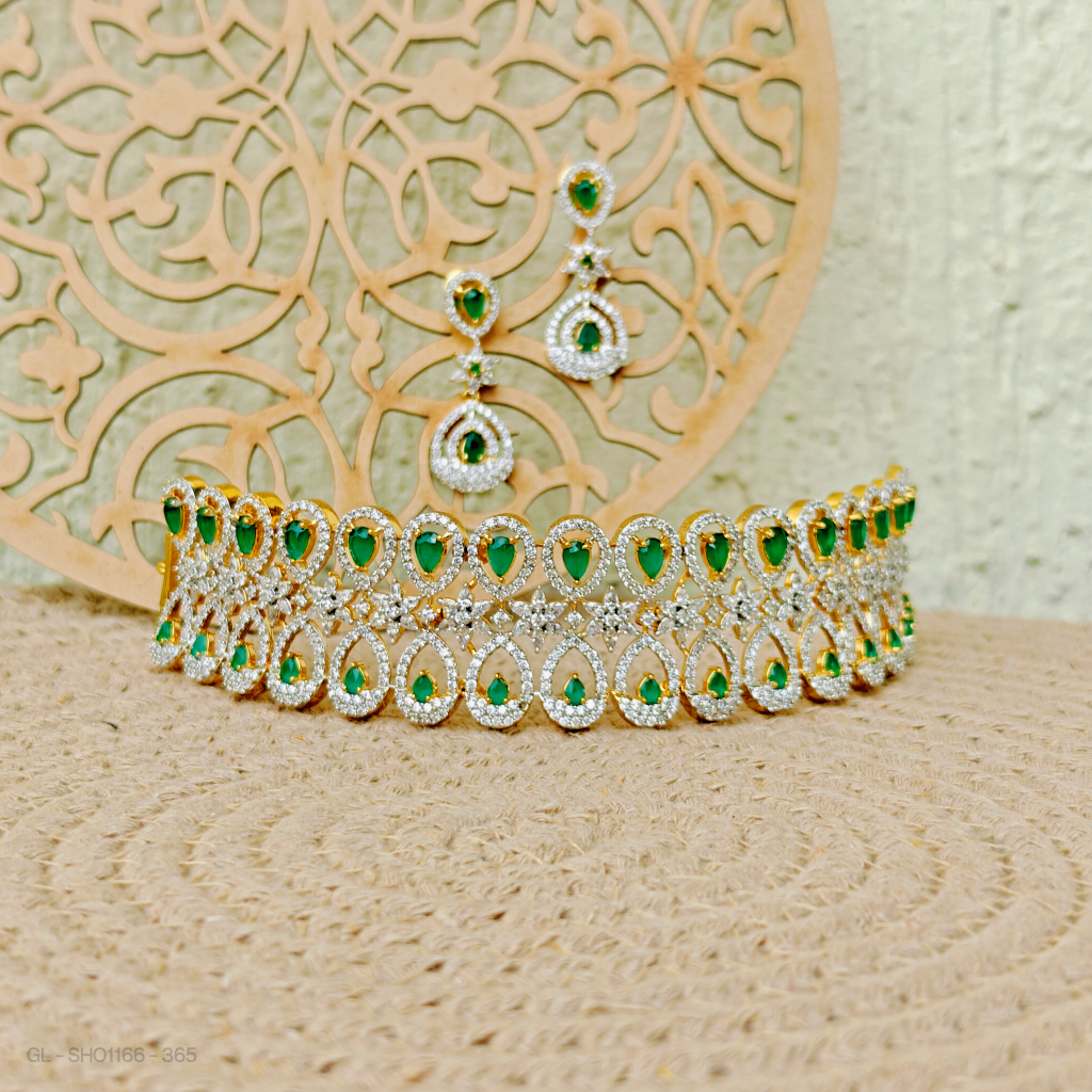 - This AD Emerald Stones Elegant Choker Necklace Set features a stunning array of Emerald Green Stones, alligned in a star shape, and includes matching earrings for a complete and elegant look.