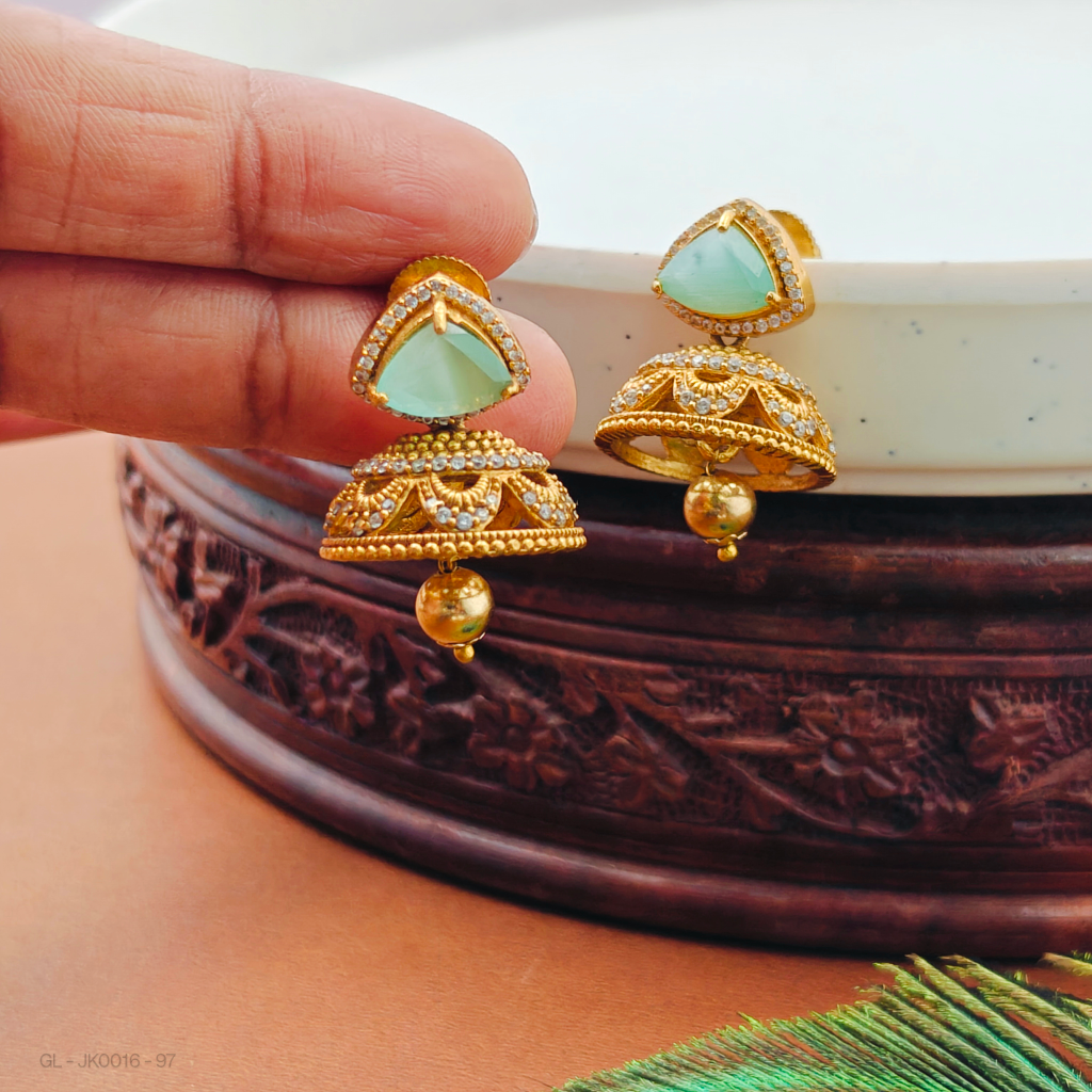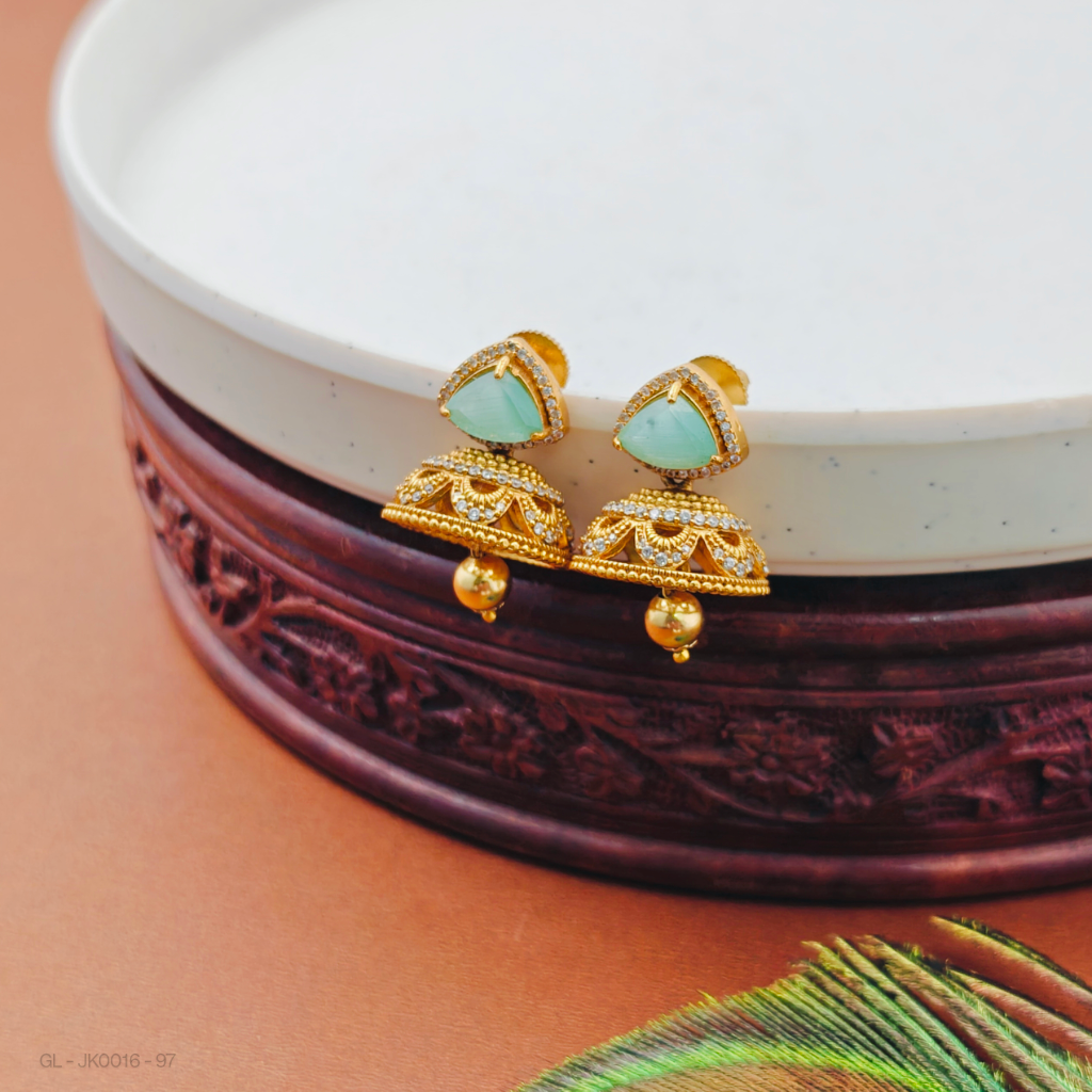 - Suitable for children, these Gold Finish Cz Pastel Stone Jhumkas are the perfect choice for adding a touch of elegance to any outfit.