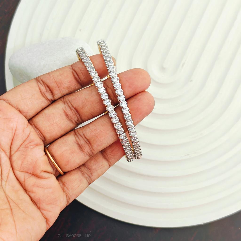 - This 2 pc Set features a Gold Finish and AD Stone Designer Bangles for a sophisticated and elegant look.