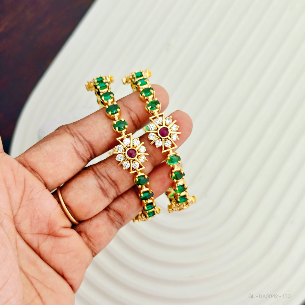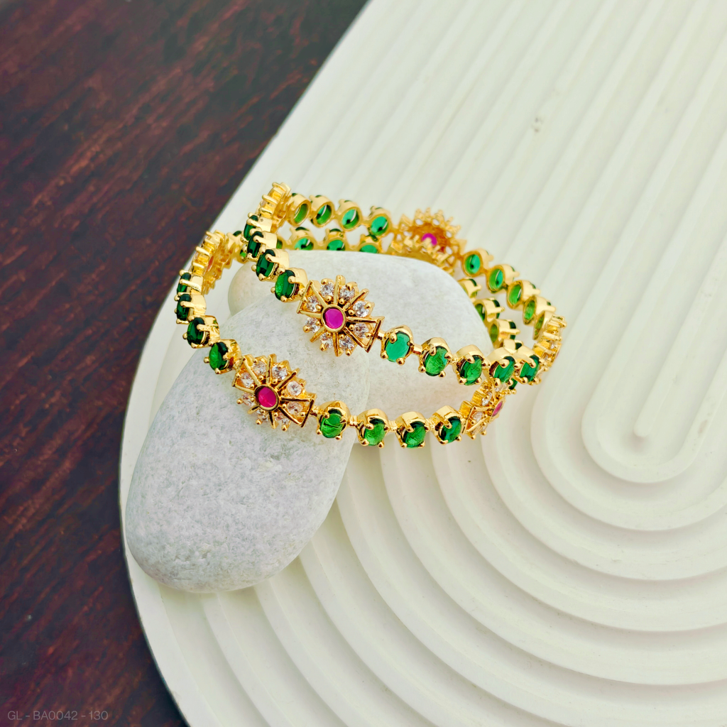 - This trendy bangle set features a gold finish and includes two pieces, each adorned with AD stones in emerald green and pink.