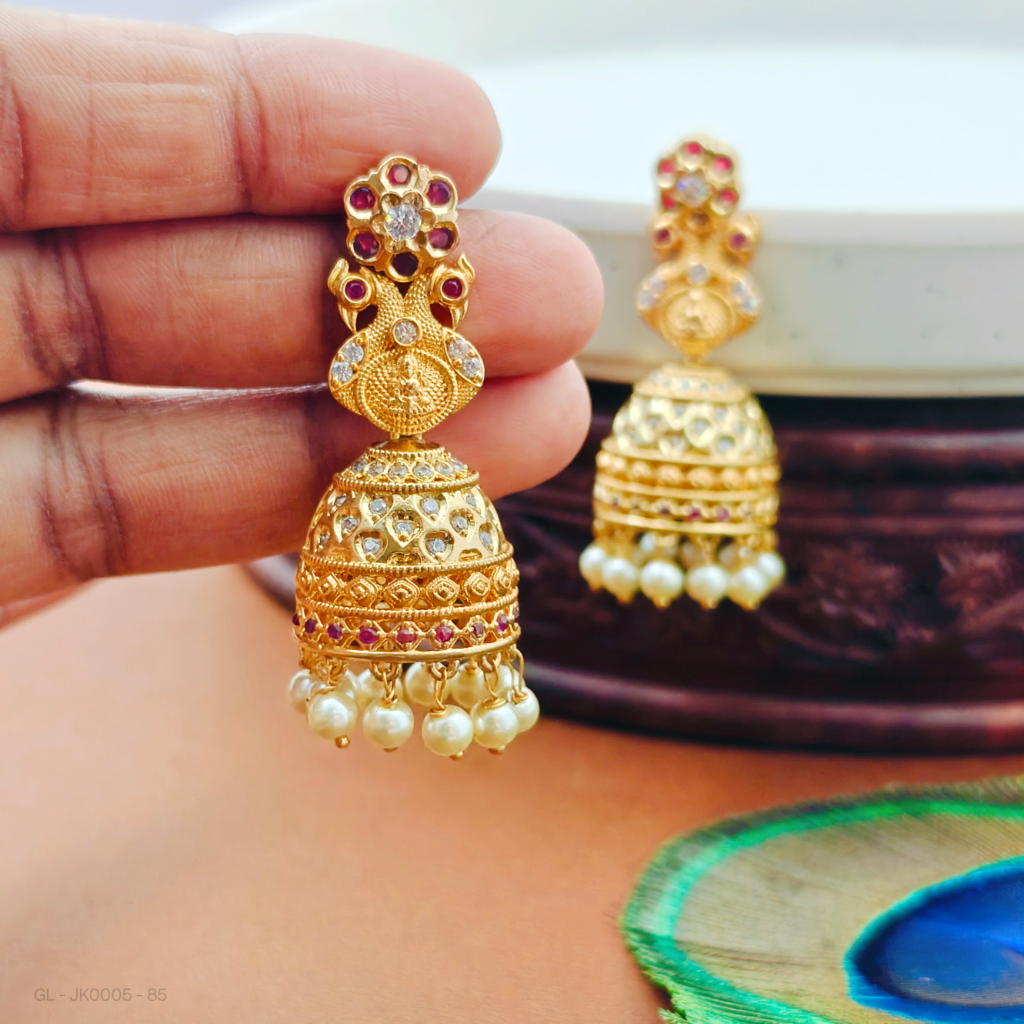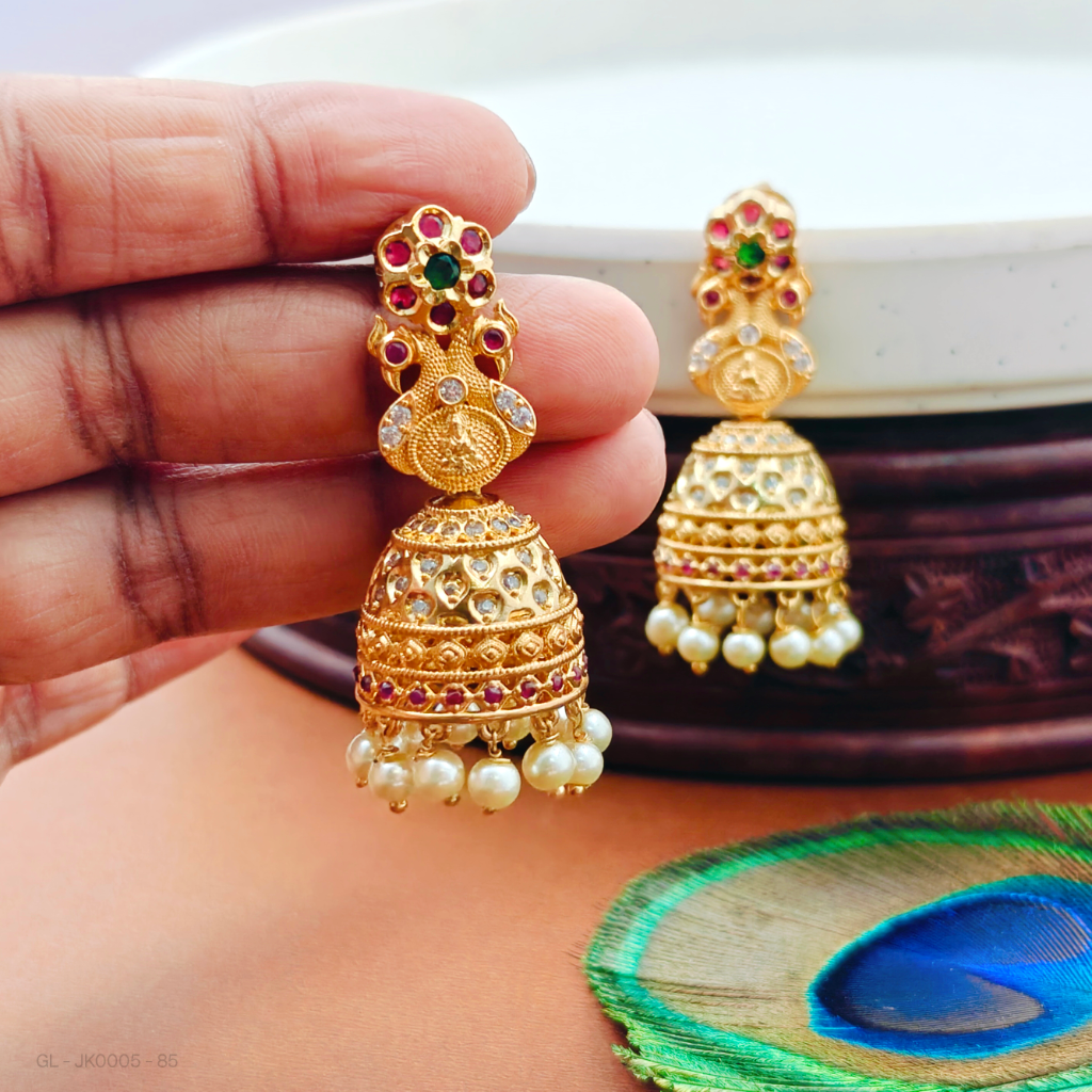- Crafted with an exquisite temple peacock design, these Gold finish CZ Jhumkas exude elegance with their stunning appearance and unique design..
