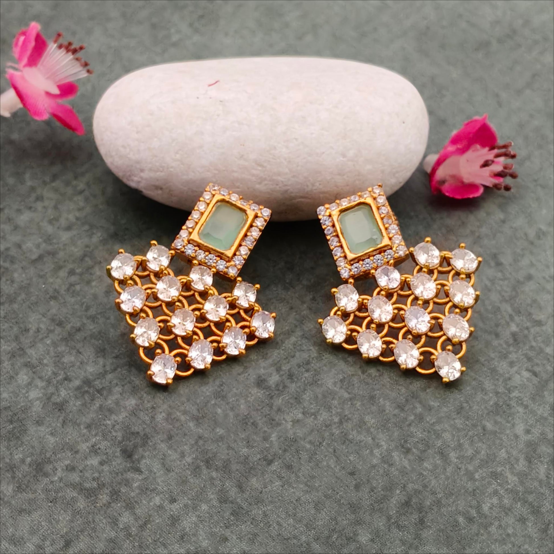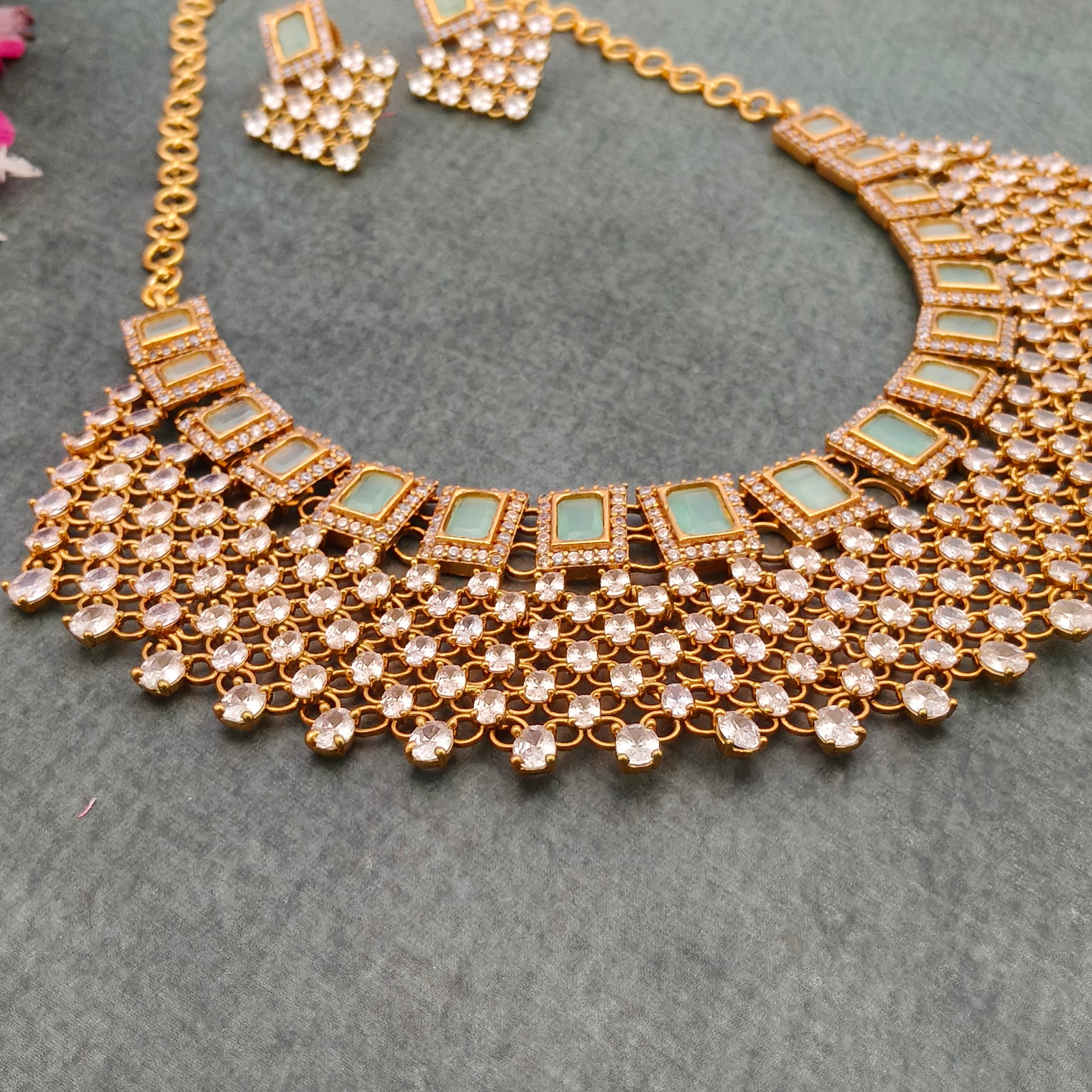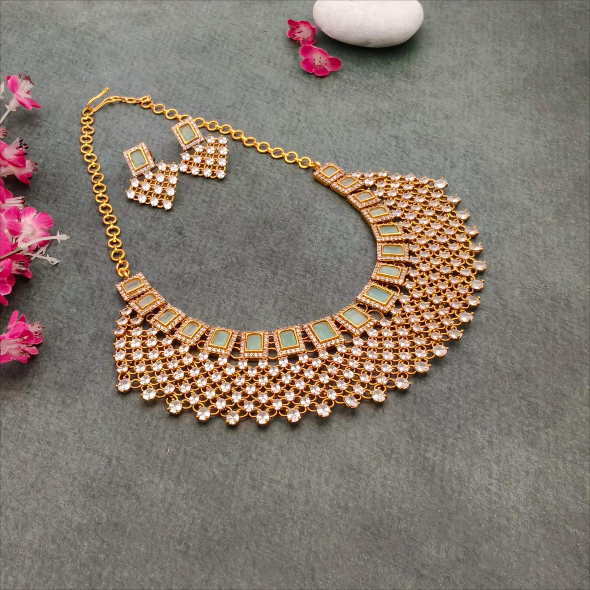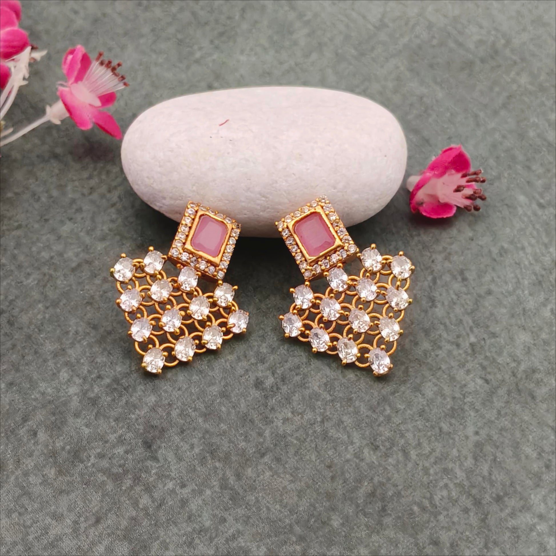 This exquisite necklace displays a designer checker link design accented by a pastel pink CZ stone, complete with coordinating earrings.