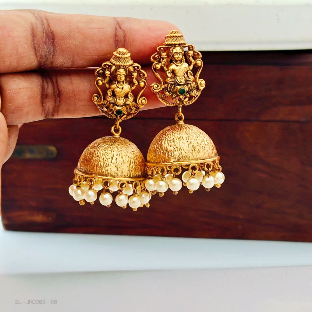 - Expertly crafted with elegant rice pearls, these Bridal Style Gold Jhumkis feature a stunning peacock design that is sure to stand out.