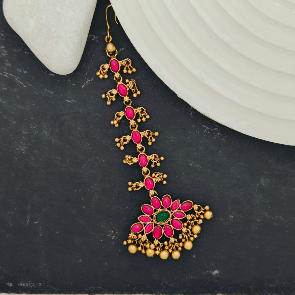 - The Tikka Head Accessory features a carefully crafted design, incorporating rubyanjd emerald stones, pearls, and a gold finish.