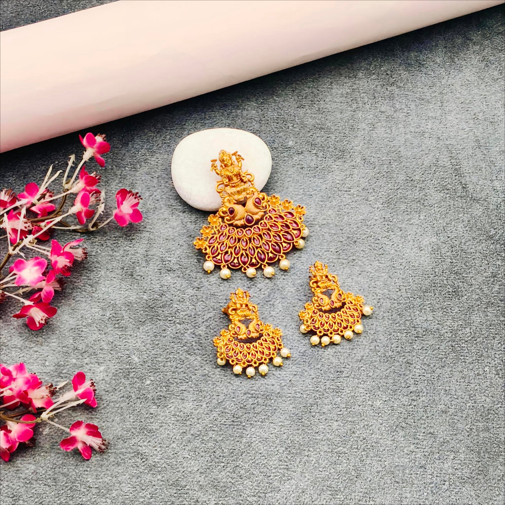 - Crafted with a stunning antique gold finish, this Lakshmi locket set is adorned with exquisite ruby stones and a majestic peacock design.