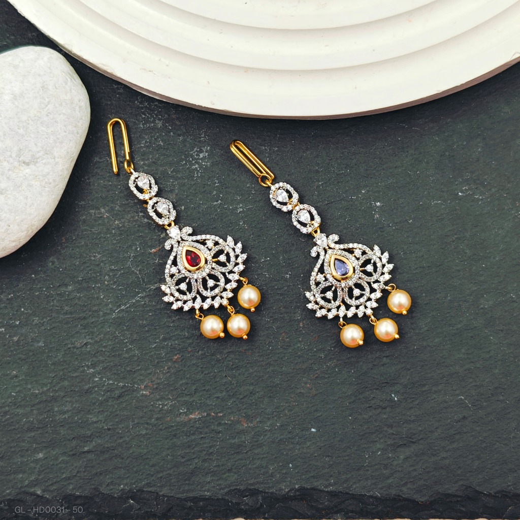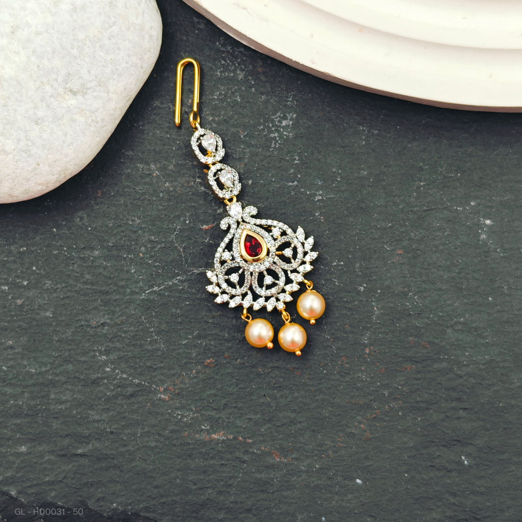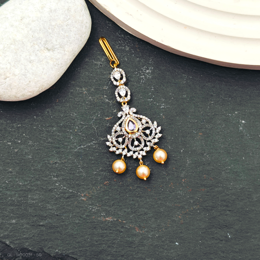 - The Tikka Head Accessory features a carefully crafted design, incorporating kemp stones, pearls, and a gold finish.