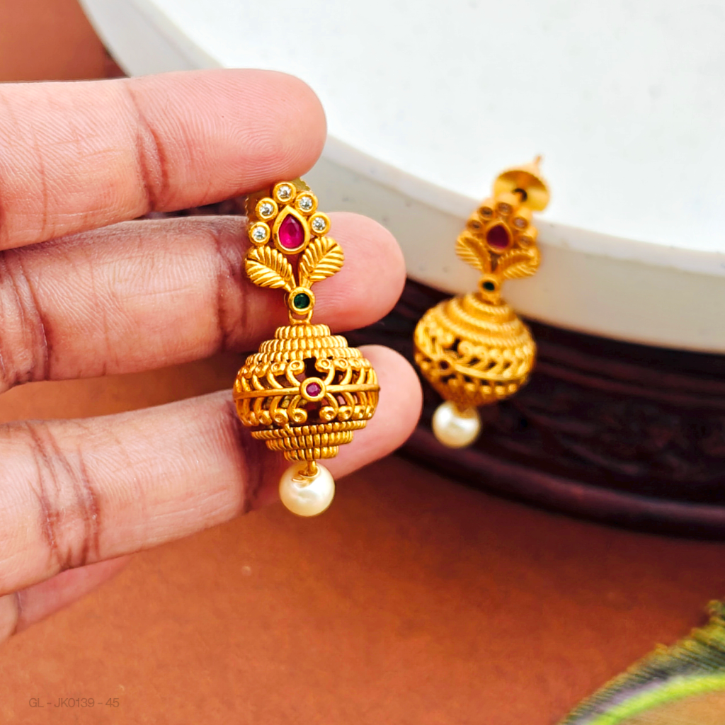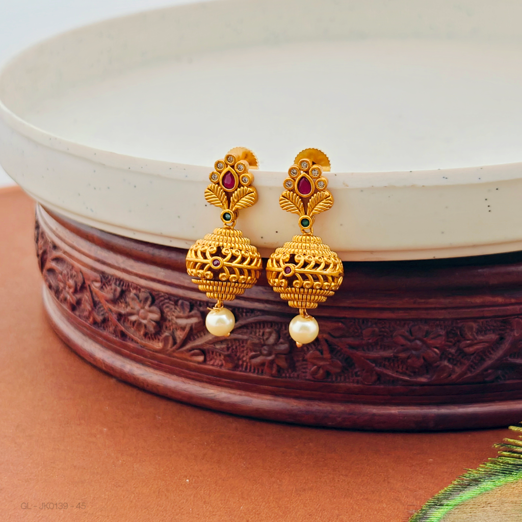 - Expertly crafted, these jhumkas feature an exquisite Floral top, complemented by vibrant ruby and Emerald stone with pearl, creating a captivating and elegant look.