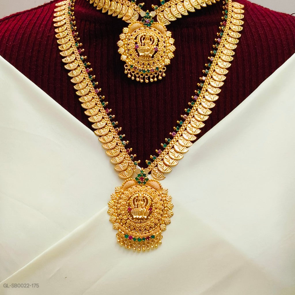Introducing the Gold finish lakshmi design Ruby and emerald stone Combo Set .This sophisticated set includes a short and long necklace without earrings