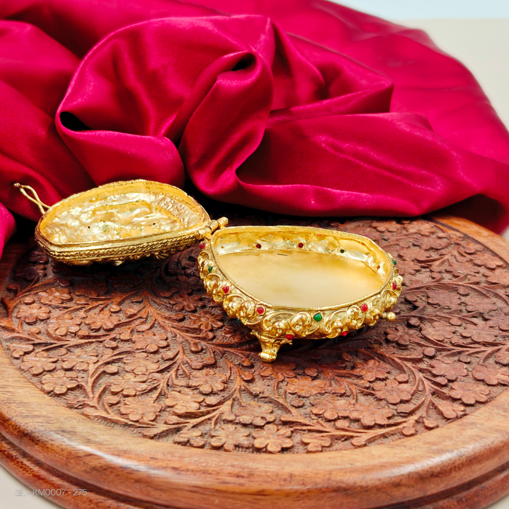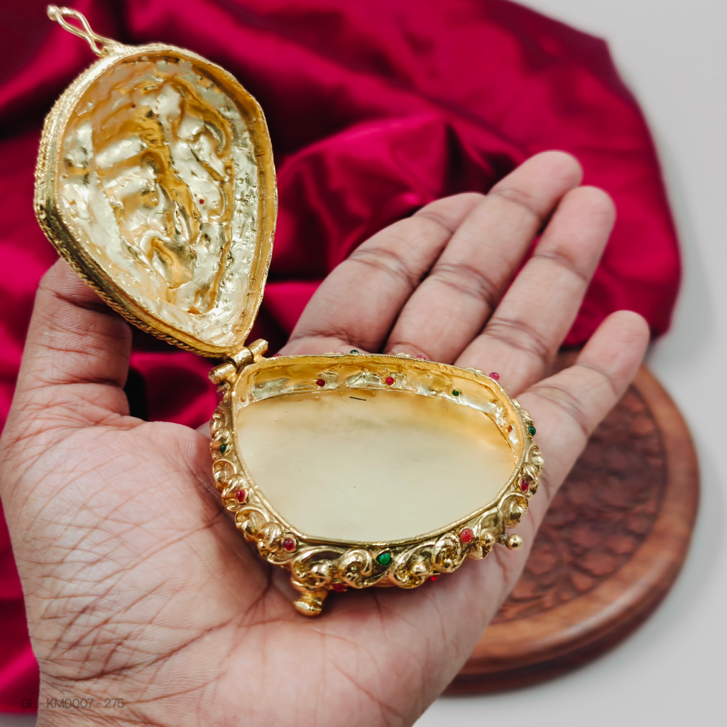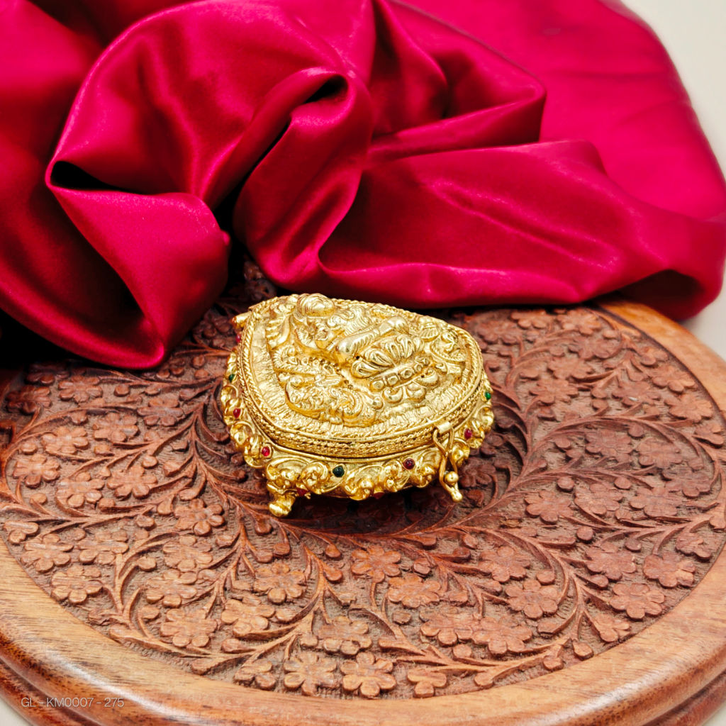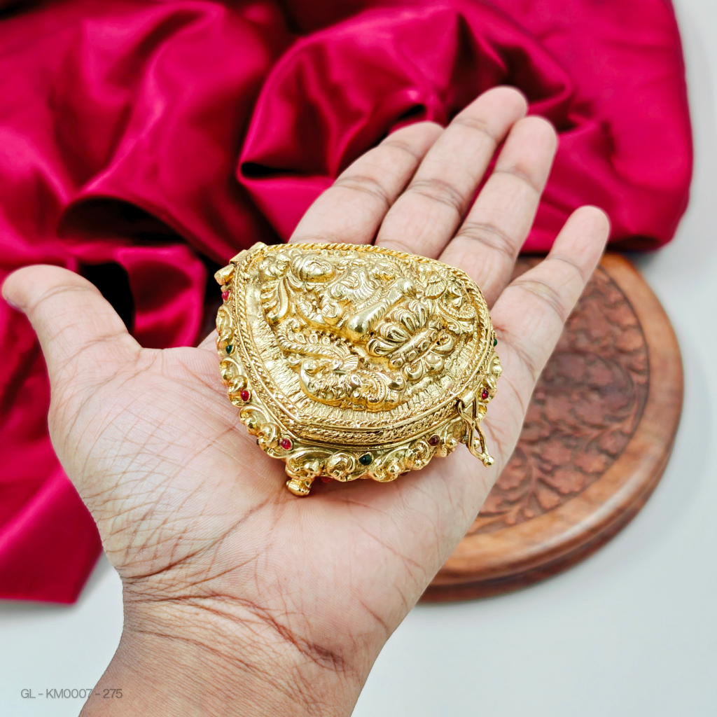 - This kumkum box has a gold-like finish with God Lakshmi and AD stones. Made from imitation materials, it offers a traditional temple style for storing kumkum.